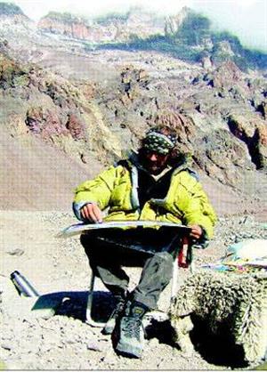 Pero no sólo desde ahí suma público cosmopolita. En la galería de arte montada en la carpa expone sus «obras coloridas y expresionistas» -según su definición-, que ganan adeptos y compradores entre los montañistas de todas partes del globo que intentan llegar a la cima, de 6959 metros. «Hay un público muy pequeño que llega y se asombra de la galería de arte más alta del planeta», dice.