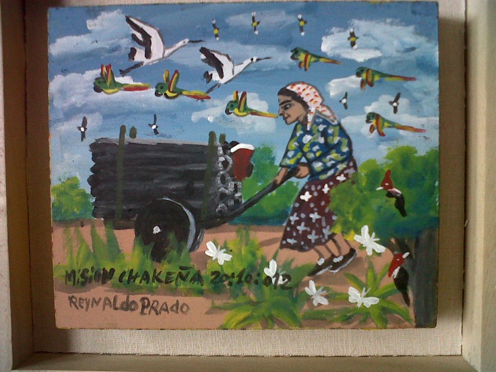 Sabe que esos paisajes costumbristas conmueven a la gente como yo, que amamos la pintura y que nos duele el cuerpo social. Aunque lo que más me emociona de su obra no esa imagen entre bucólica e inocente, naif… Enternece, también, su letra de niño, que escribe en dos lenguas, la suya y la nuestra, que esa mujer rodeada de cigüeñas, loros y pájaros carpinteros, se está preparando para cocinar. Pero lo que realmente me emociona es ver cómo no puede escapar de sus raíces más ancestrales y en todo el perímetro del bastidor pinta motivos geométricos que lo hermanan con sus antepasados wichis, con los dibujos del chaguar que acaso esconden su historia y su alfabeto.