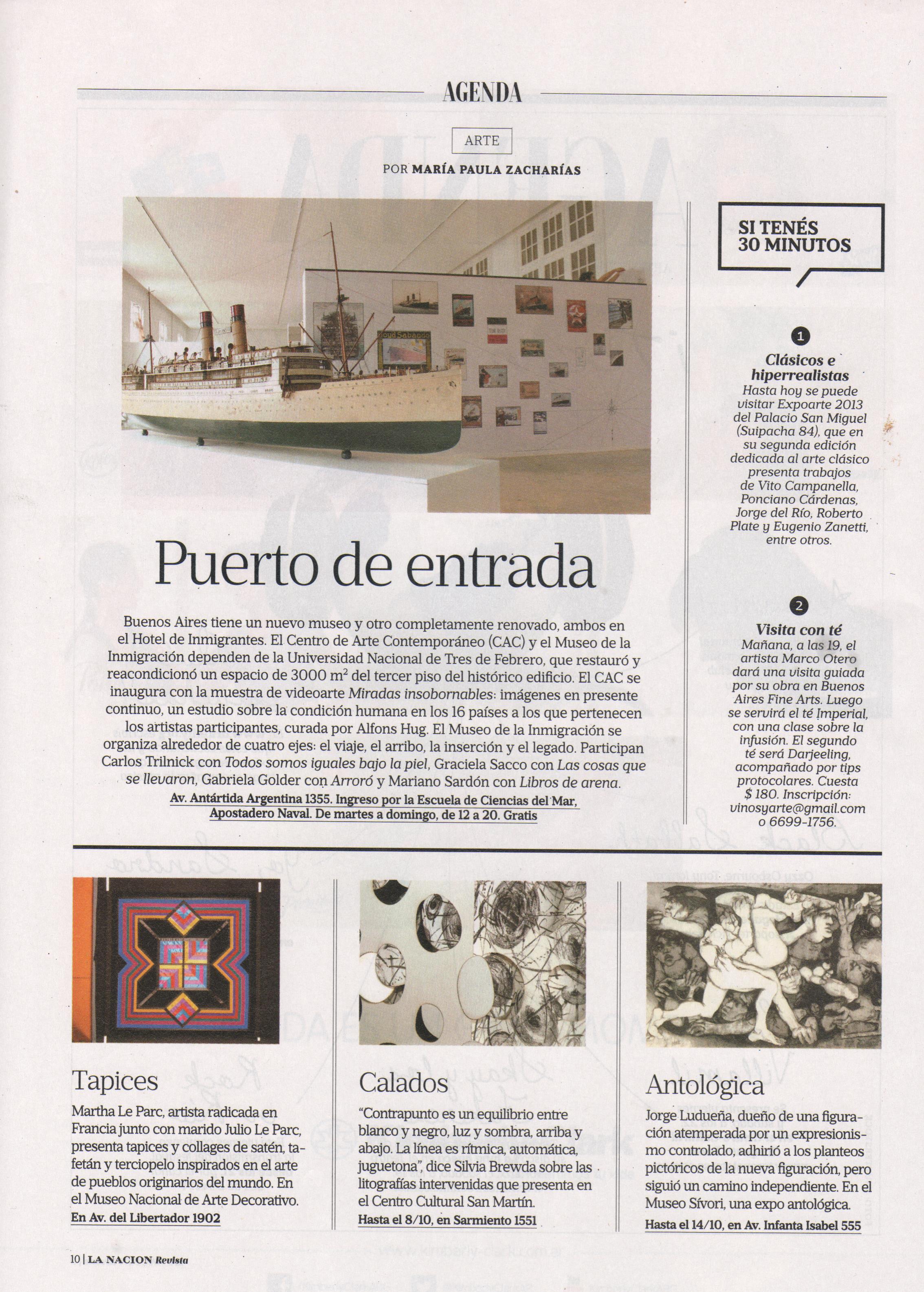 Buenos Aires tiene un museo nuevo y otro completamente renovado, ambos en el Hotel de Inmigrantes. El Centro de Arte Contemporáneo (CAC) y el Museo de la Inmigración dependen de la Universidad Nacional de Tres de Febrero, que restauró y reacondicionó un espacio de 3000 m² en el tercer piso del Hotel de Inmigrantes, donde funcionan. El CAC se inaugura con la muestra de video arte Miradas insobornables: imágenes en presente continuo, un estudio sobre la condición humana en los 16 países a los que pertenecen los artistas participantes, curada por Alfons Hug. El Museo de la Inmigración se organiza en torno de los ejes el viaje, el arribo, la inserción y el legado. Participan Carlos Trilnick con Todos somos iguales bajo la piel, Graciela Sacco con Las cosas que se llevaron, Gabriela Golder con Arroró y Mariano Sardón con Libros de arena.