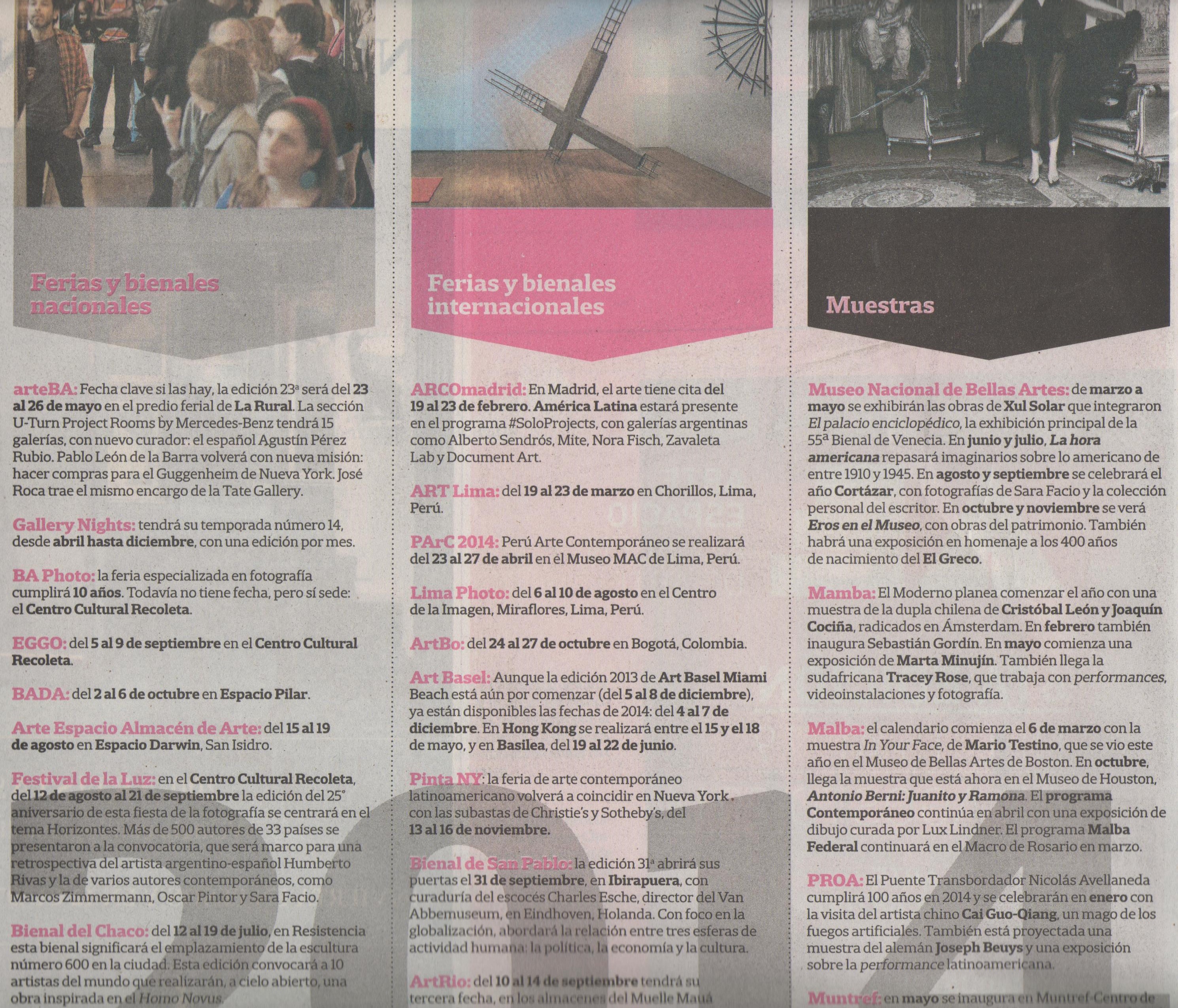 En 2014, llegarán al país las dos muestras que llevaron al arte argentino por el mundo. Del Museo de Houston viene Antonio Berni: Juanito y Ramona al Malba. Y la exhibición principal de la 55º Bienal de Venecia, la muestra de Xul Solar, El palacio enciclopédico, se podrá ver en el Museo Nacional de Bellas Artes. El 2014 será un año de festejos: Año Cortázar, los 400 de El Greco, los 50 de Mafalda y los 100 del Puente Transbordador Nicolás Avellaneda, y tendrán en los museos sus homenajes. Aunque todavía en los museos y centros culturales se están negociando las muestras del año que viene, ya se sabe de artistas nacionales e internacionales que tendrán exhibiciones: alemán Joseph Beuys, el fotógrafo Mario Testino y la dupla chilena León&Cociña, y retrospectivas del escultor Alfredo Bigatti, Marta Minujín, Ernesto Deira, Rómulo Macció y Annemarie Heinrich, entre muchos otros. Un año con mucho para ver.