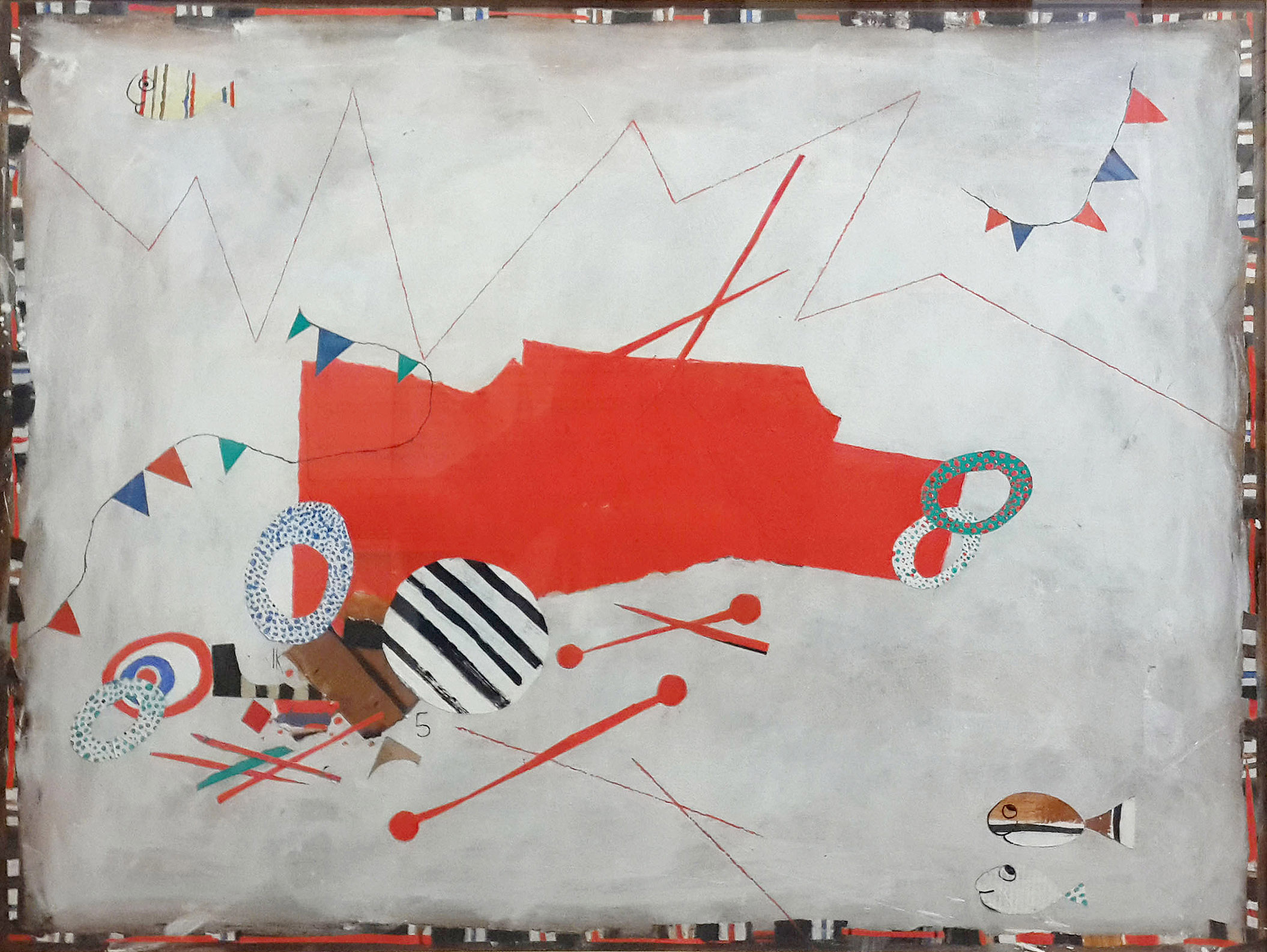 Ides Kihlen presenta óleos y acrílicos que suman recortes de papel. Un repaso por sus etapas y sus temas recurrentes: los peces, el número 5, banderines y geometrías bailantes al ritmo de su son de pianista. La acompaña en el Paseo de las Artes Duhau La esculturas Rabbits & Gatekeepers de Marcelo Ortíz.