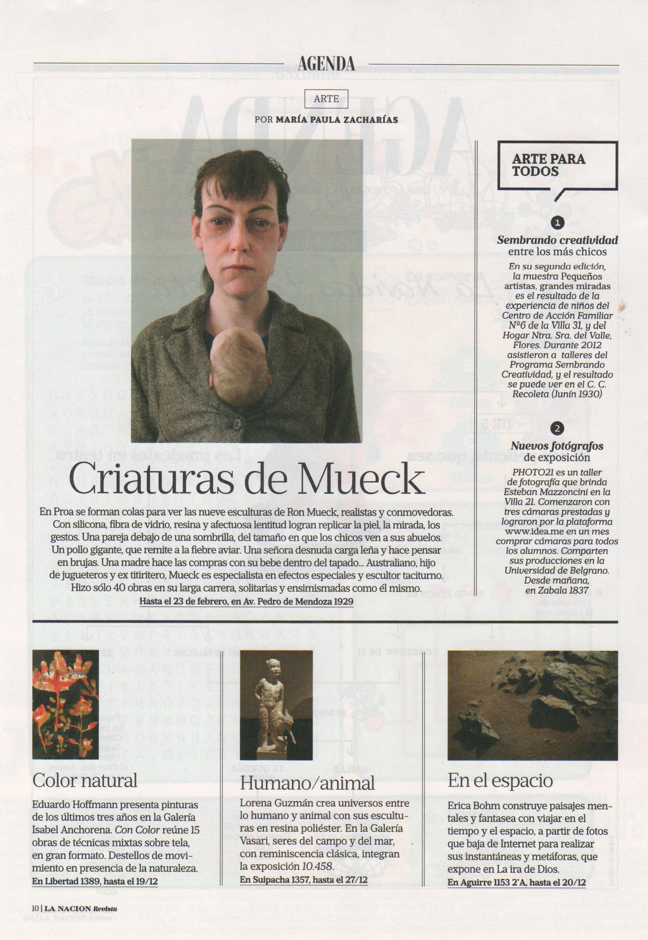 En Proa se forman colas para ver las nueve esculturas de Ron Mueck, realistas y conmovedoras. Les falta hablar y medir 1,70 para ser perfectos humanos, porque con silicona, fibra de vidrio, resina y afectuosa lentitud logra replicar la piel, la mirada, los gestos. La pareja de ancianos que está bajo una sombrilla se ve del tamaño en que los chicos ven a sus abuelos, más grandes. Hay un pollo gigante, que remite a la fiebre aviar, una máscara de Mueck y siete seres de alrededor de un metro que disparan la fantasía. ¿Quiénes son?, ¿qué les pasa?, ¿de dónde vienen? Una señora desnuda carga leña y hace pensar en las brujas. Una madre hace las compras con su bebé dentro del tapado, y no se sabe si está triste, cansada o aburrida. Una pareja joven va abrazada, pero detrás se ve la chica está agarrada por la fuerza ¿o están jugando? Australiano, hijo de jugueteros alemanes, ex titiritero, es especialista en efectos especiales y escultor taciturno. En el video del auditorio, Mueck muestra la cocina de sus obras, que en toda su carrera son sólo 40, solitarias y ensimismadas como él mismo, que rara vez habla de sus criaturas.