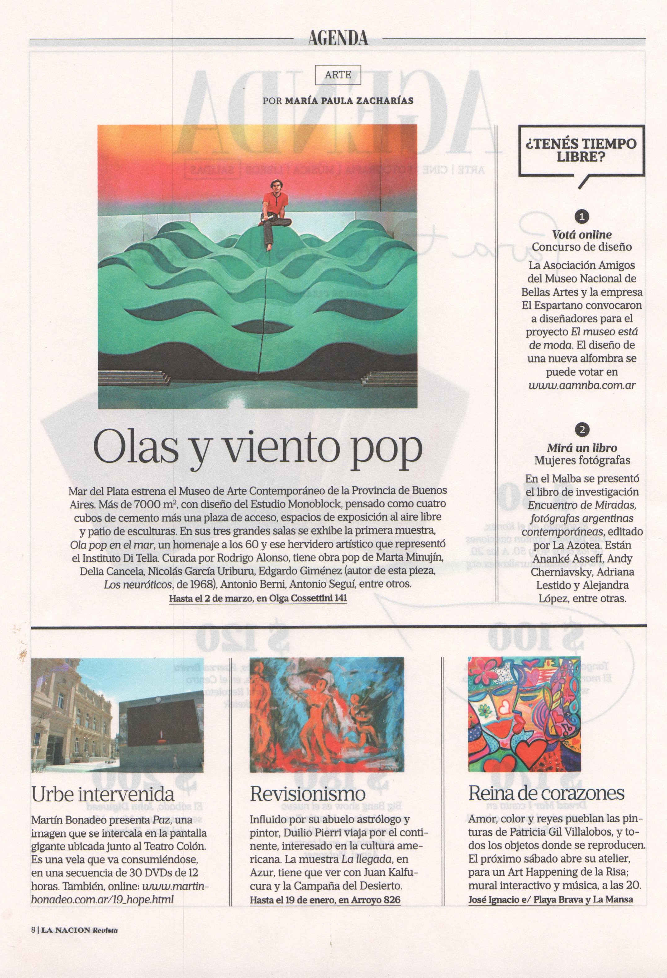 Mar del Plata estrena esta temporada el MAR, flamante Museo de Arte Contemporáneo de la Provincia de Buenos Aires. Más de 7000 metros cuadrados construidos en tres años, con diseño del Estudio Monoblock, pensado como cuatro cubos de cemento más una plaza de acceso, espacios de exposición al aire libre y patio de esculturas. En sus tres grandes salas se exhibe la primera muestra, Ola pop en el mar. Se trata de un homenaje a los ’60 y ese hervidero artístico que representó el Instituto Di Tella. Curada por Rodrigo Alonso, tiene obra pop de Marta Minujín, Delia Cancela, Pablo Mesejean, Nicolás García Uriburu, Edgardo Giménez (autor de esta pieza, Los neuróticos, de 1968), Jorge de la Vega, Rómulo Macció, Elsa Soibelman, Marie Orensanz, Alberto Greco, Antonio Berni, Antonio Seguí, Narcisa Hirsch, Juan Stoppani, Eduardo Costa y Fernando Maza, entre otros. El programa cultural incluye recitales al aire libre de Kevin Johansen, Peteco Carabajal, Nacha Guevara, Palito Ortega, Elena Roger y Escalandrum, entre otros, muestras-homenaje a Sandro y a Alberto Olmedo, cine y noches de música con DJs y bandas locales.
