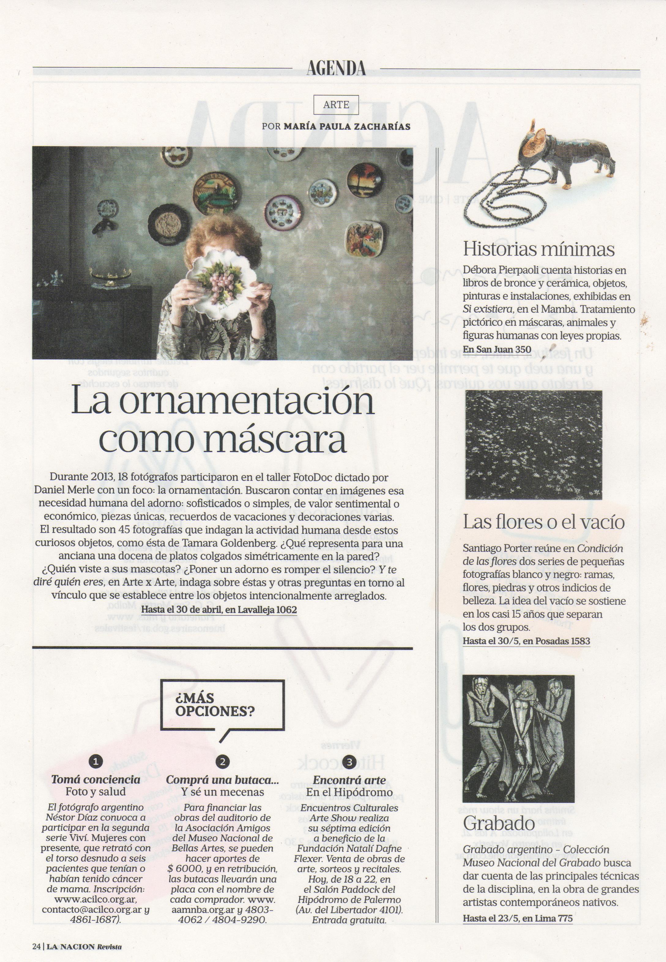 Durante 2013, 18 fotógrafos participaron en el taller FotoDoc dictado por Daniel Merle con un foco: la ornamentación. Buscaron contar en imágenes esa necesidad humana del adorno: sofisticados o simples, de valor sentimental o económico, piezas únicas, recuerdos de vacaciones y decoraciones varias. El resultado son 45 fotografías que indagan la actividad humana desde estos curiosos objetos, como ésta de Tamara Goldenberg. ¿Qué representa para una anciana una docena de platos colgados simétricamente en la pared? ¿Quién viste a sus mascotas? ¿Poner un adorno es romper el silencio? Y te diré quién eres, en la Galería Arte x Arte, indaga sobre éstas y otras preguntas en torno al vínculo que se establece entre los objetos intencionalmente arreglados, para remarcar o enmascarar la identidad.