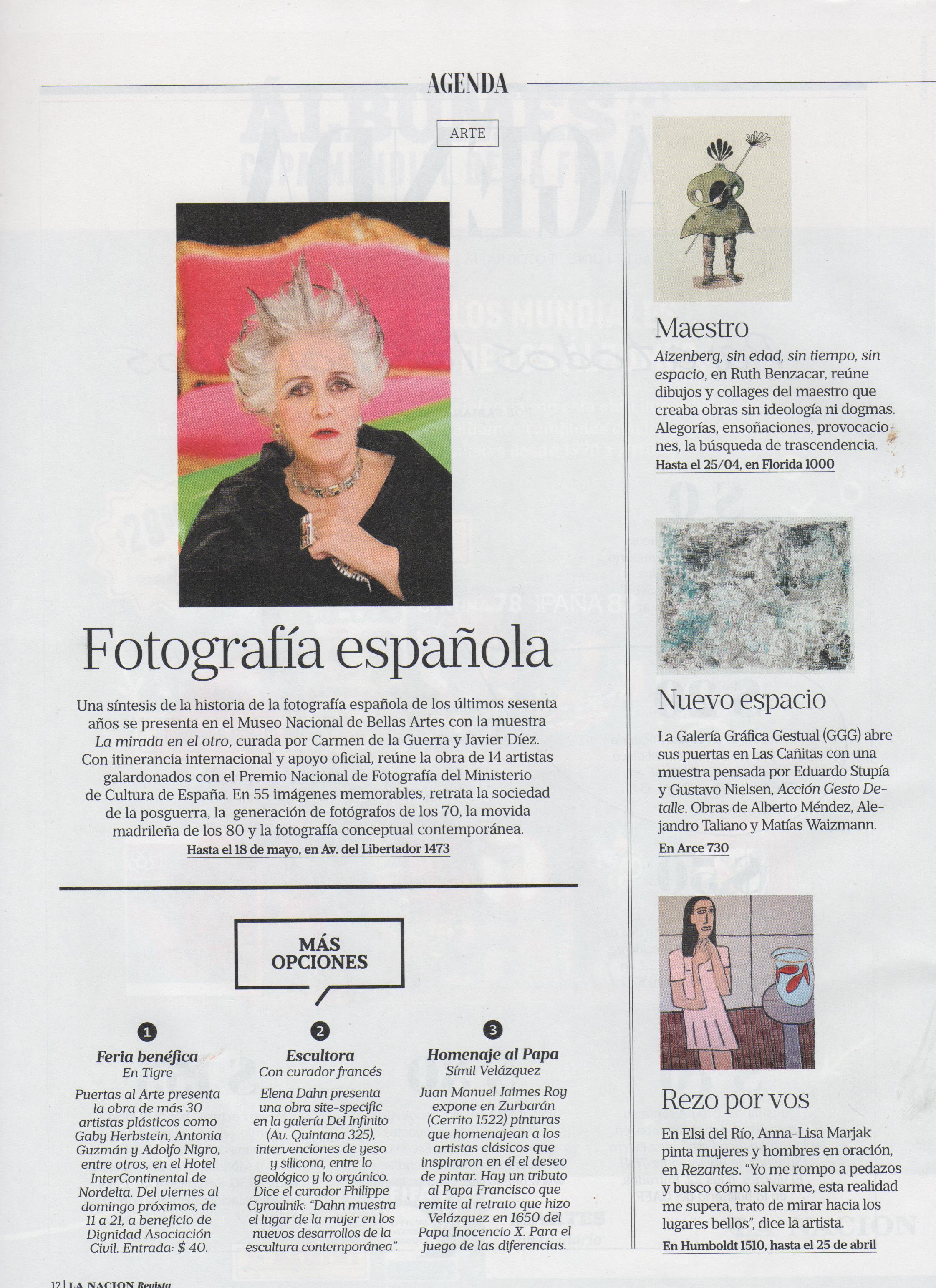 Una síntesis de la historia de la fotografía española de los últimos sesenta años se presenta en el Museo Nacional de Bellas Artes con la muestra La mirada en el otro, curada por Carmen de la Guerra y Javier Díez. Con itinerancia internacional y apoyo oficial, reúne la obra de 14 artistas galardonados con el Premio Nacional de Fotografía del Ministerio de Cultura de España, desde su creación en 1994 hasta 2008, que son documento de seis décadas de la madre patria. En 55 imágenes memorables, retrata la sociedad de la posguerra, con piezas de Gabriel Cualladó, Ramón Masats y Joan Colom, y la generación de fotógrafos de los ‘70, con el trabajo documental de Cristina García Rodero y del argentino radicado en España Humberto Rivas. También, la movida madrileña de los ’80, representada por Alberto García-Alix, Pablo Pérez –Mínguez y Ouka Leele (autor de este retrato de la actriz Chus Lampreave) y la fotografía conceptual contemporánea, con Chema Madoz, Joan Fontcuberta y Manuel Vilariño.