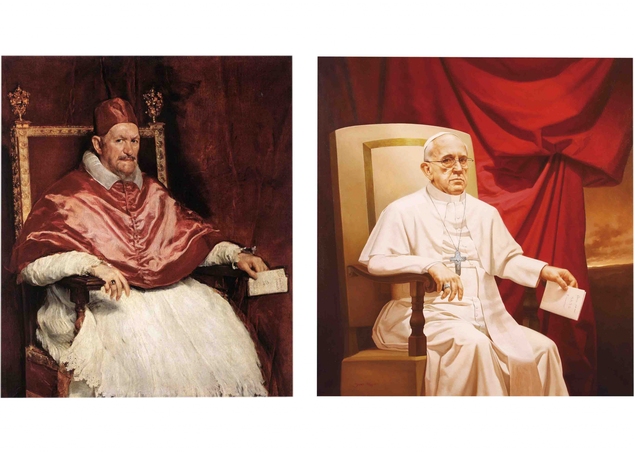 Juan Manuel Jaimes Roy expone en Zurbarán (Cerrito 1522) pinturas que son homenajes a aquellos artistas de la pintura clásica que inspiraron en él el deseo de pintar. En esa serie, hay un homenaje al Papa Francisco que remite al retrato que hizo Velázquez en 1650 del Papa Inocencio X. Para el juego de las diferencias.
