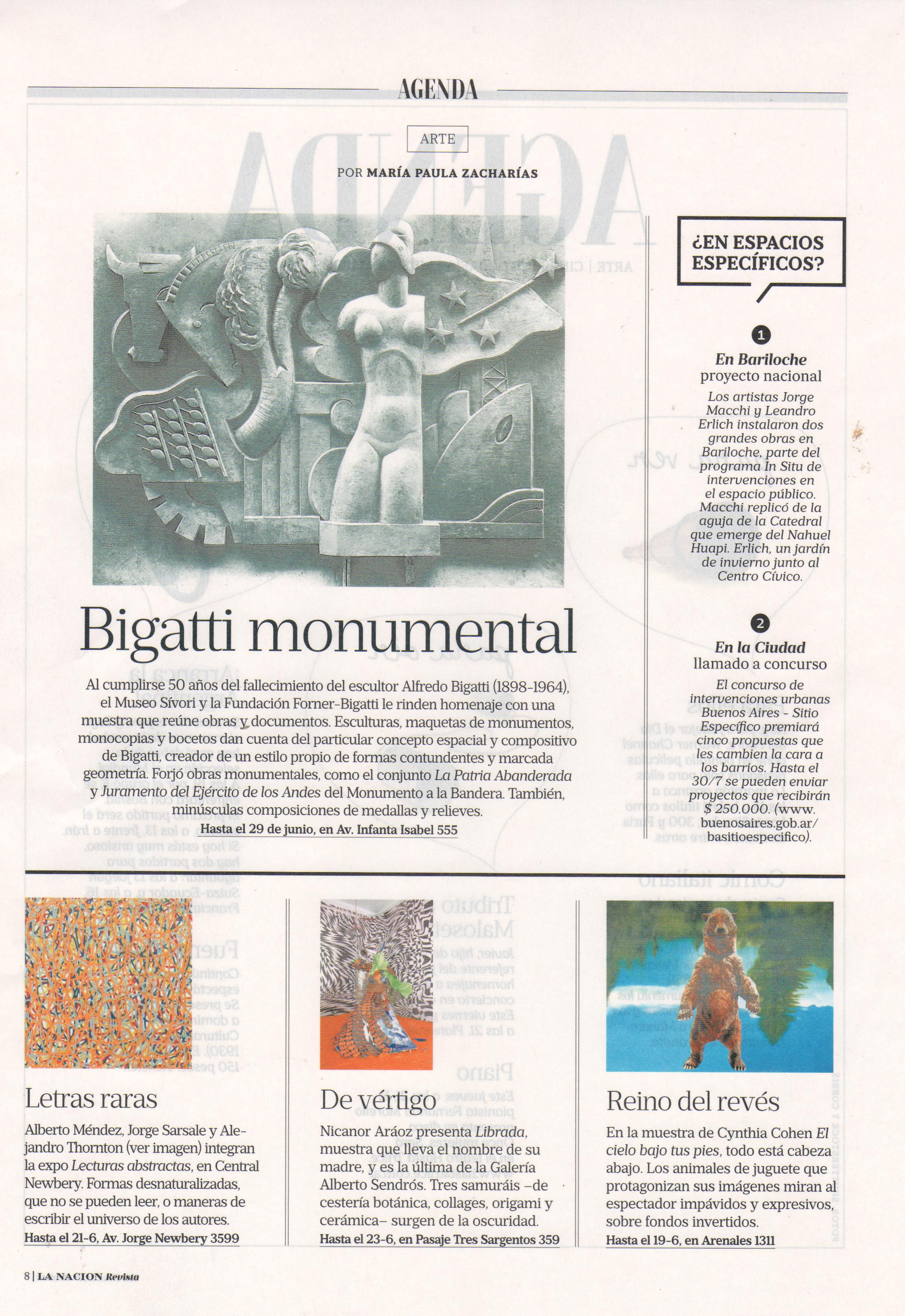 Al cumplirse 50 años del fallecimiento del escultor Alfredo Bigatti (1898-1964), el Museo Sívori y la Fundación Forner-Bigatti le rinden homenaje con una muestra que reúne obras y documentos. Esculturas, maquetas de monumentos, monocopias y bocetos dan cuenta del particular concepto espacial y compositivo de Bigatti, creador de un estilo propio de formas contundentes y marcada geometría. Forjó obras monumentales, como el conjunto La Patria Abanderada y Juramento del Ejército de los Andes del Monumento a la Bandera, en el que trabajó entre 1942 y 1952. También, minúsculas composiciones de medallas y relieves. Sus discípulos Antonio Pujía y Leo Vinci darán charlas en el marco de la muestra.
