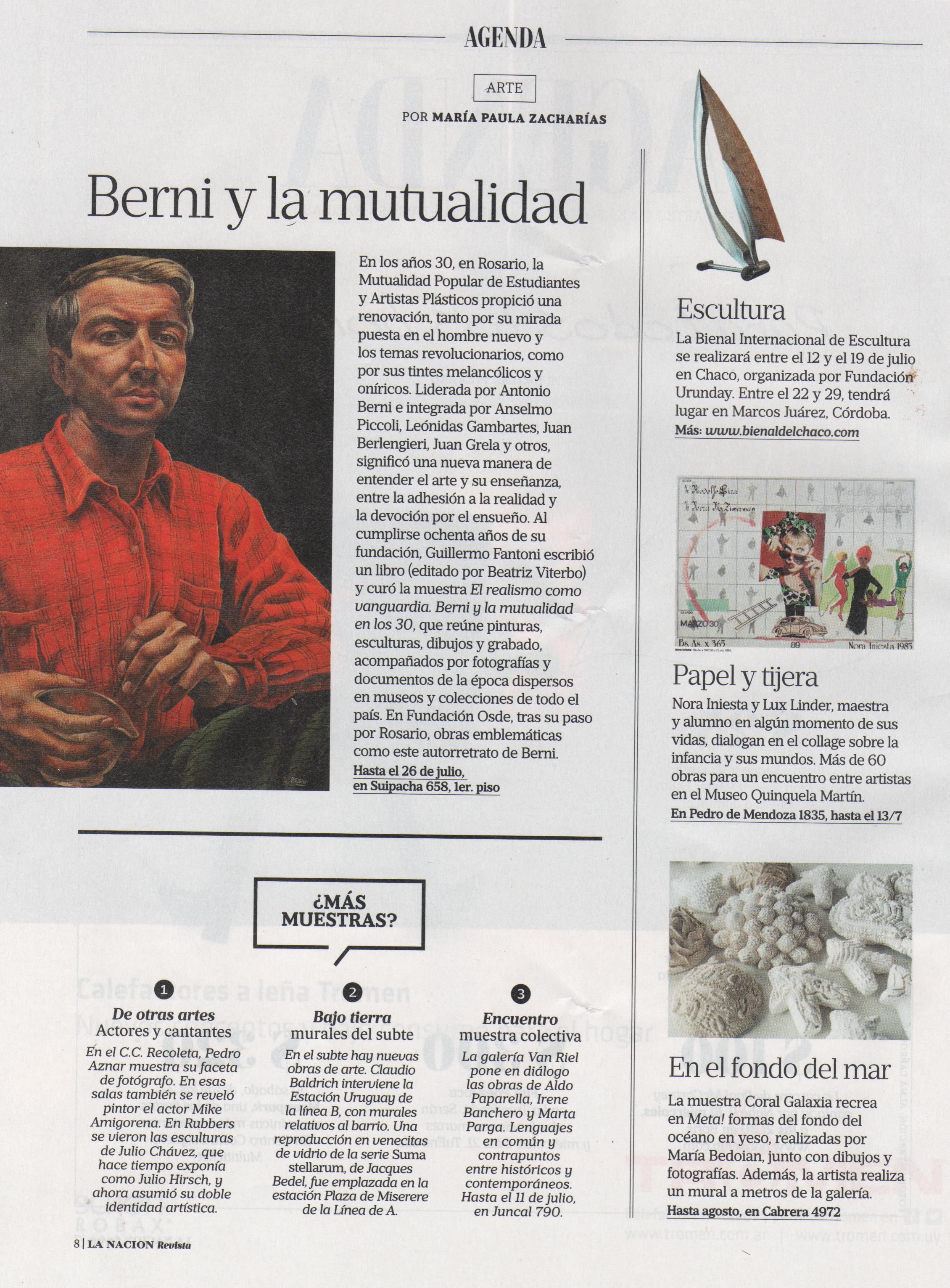 En los años 30, en Rosario, la Mutualidad Popular de Estudiantes y Artistas Plásticos propició una renovación, tanto por su mirada puesta en el hombre nuevo y los temas revolucionarios, como por sus tintes melancólicos y oníricos. Liderada por Antonio Berni e integrada por Anselmo Piccoli, Leónidas Gambartes, Juan Berlengieri, Juan Grela y otros, significó una nueva manera de entender el arte y su enseñanza, entre la adhesión a la realidad y la devoción por el ensueño. Al cumplirse ochenta años de su fundación, Guillermo Fantoni escribió un libro (editado por Beatriz Viterbo) y curó la muestra El realismo como vanguardia. Berni y la mutualidad en los 30, que reúne pinturas, esculturas, dibujos y grabado, acompañados por fotografías y documentos de la época dispersos en museos y colecciones de todo el país. En Fundación Osde, después de su paso por Rosario, obras emblemáticas como este autorretrato de Berni.