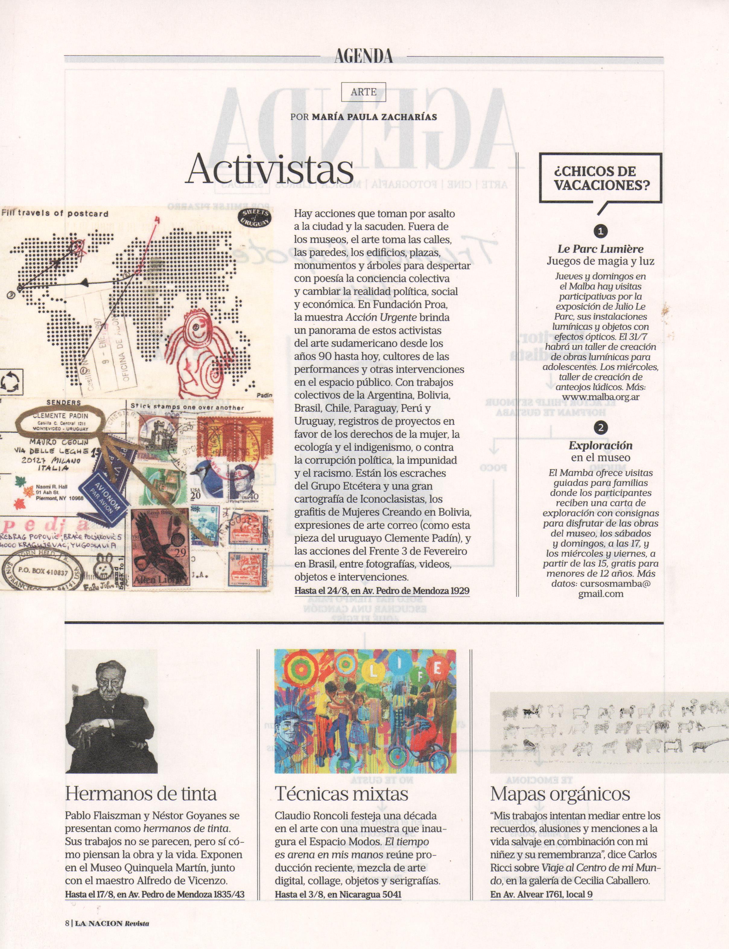 Hay acciones que toman por asalto a la ciudad y la sacuden. Fuera de los muesos, el arte toma las calles, las paredes, edificios, plazas, monumentos y árboles, para despertar con poesía a la consciencia colectiva y cambiar la realidad política, social y económica. En Fundación Proa la muestra Acción Urgente brinda un panorama de estos activistas del arte sudamericano desde los 90 hasta hoy, cultores de la performance y otras intervenciones en el espacio público. Con trabajos colectivos de la Argentina, Bolivia, Brasil, Chile, Paraguay, Perú y Uruguay, registros de proyectos en favor de los derechos de la mujer, la ecología y el indigenismo, o contra la corrupción política, la impunidad y el racismo. Están los escraches del Grupo Etcétera y una gran cartografía de Iconoclasistas, los grafitis de Mujeres Creando en Bolivia, expresiones de arte correo, como esta pieza del uruguayo Clemente Padín, y las acciones del Frente 3 de Fevereiro en Brasil, entre fotografías, videos, objetos e intervenciones.