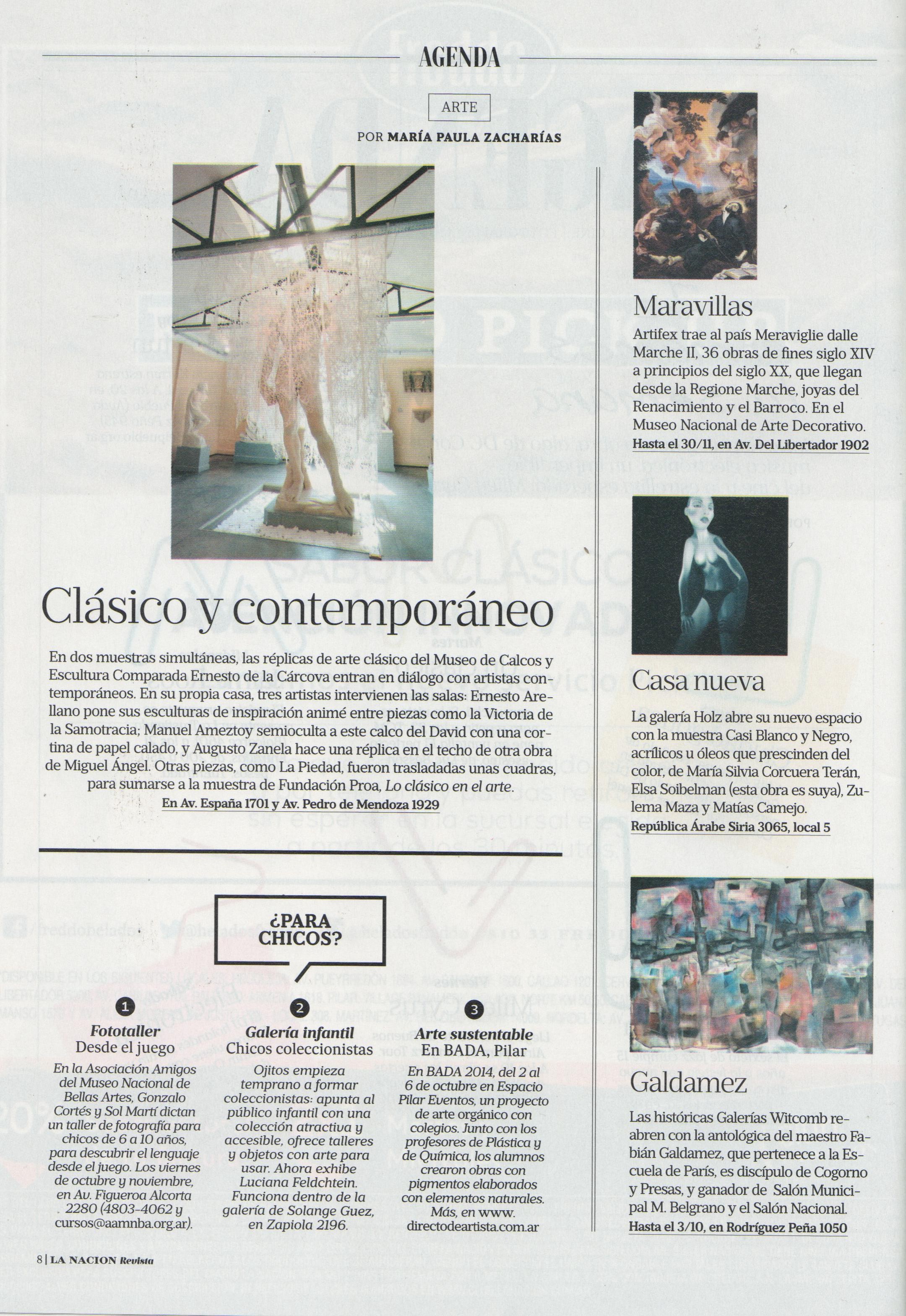 En dos muestras simultáneas, las réplicas de arte clásico del Museo de Calcos y Escultura Comparada Ernesto de la Cárcova entran en diálogo con artistas contemporáneos. En su propia casa, tres artistas intervienen las salas: Ernesto Arellano pone sus esculturas de inspiración animé entre piezas como la Victoria de la Samotracia, Manuel Ameztoy semioculta a este calco del David con una cortina de papel calado y Augusto Zanela hace una réplica en el techo de otra obra de Miguel Ángel, el proyecto urbano del Campidoglio. Otras piezas, como La Piedad, fueron trasladadas unas cuadras, para sumarse a la muestra de Fundación Proa, Lo clásico en el arte, donde esculturas y pinturas históricas dialogan con artistas actuales como Michelangelo Pistoletto, Vanessa Beecroft, Sam Durant y Giulio Paolini, entre otros, curadas por Giacinto Di Pietrantonio, en colaboración con la Accademia Carrara de Bergamo. En Proa también se puede ver la retrospectiva de Fabio Mauri, artista italiano crítico de la sociedad actual y de todo totalitarismo.