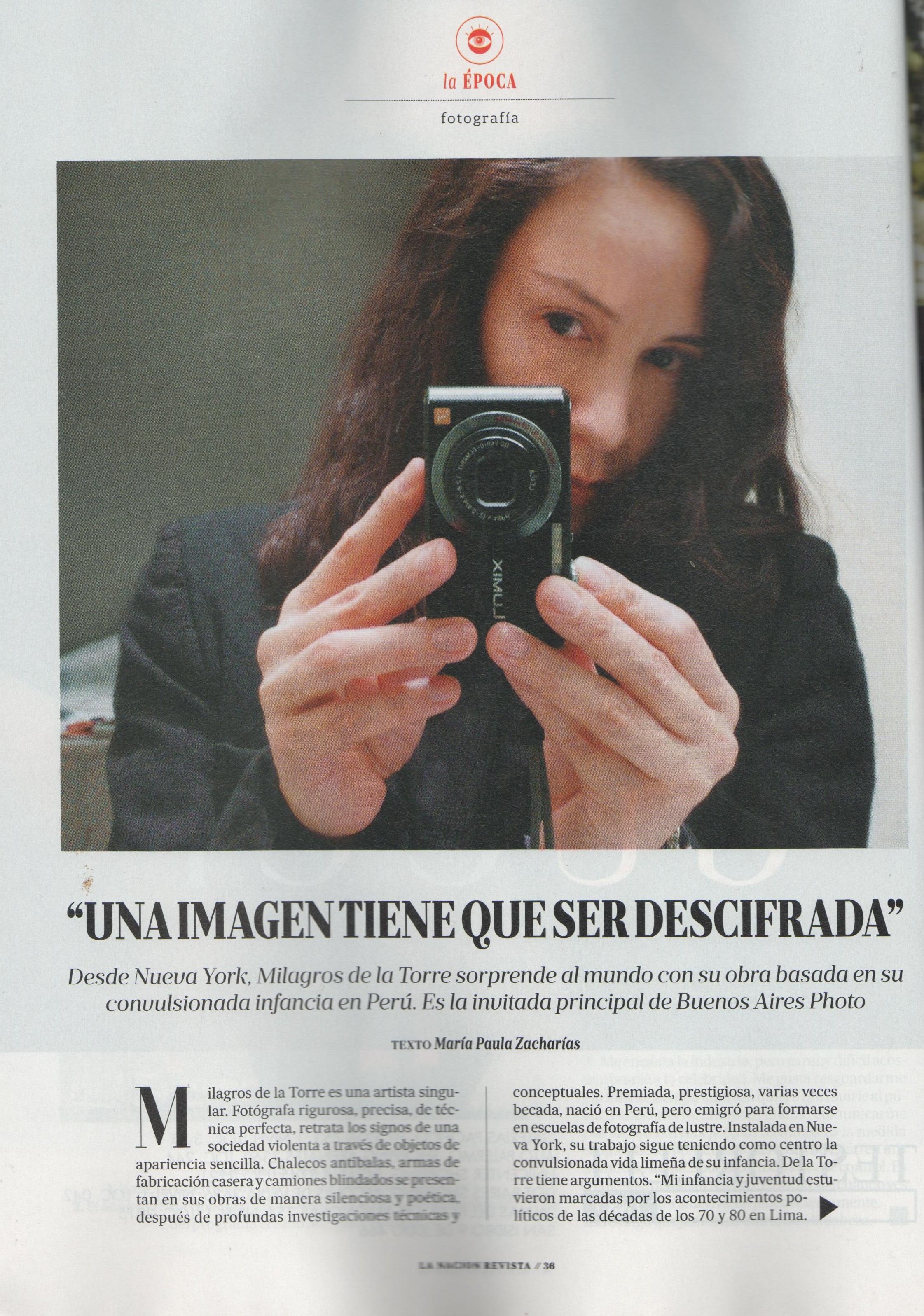 Milagros de la Torre es una artista singular. Fotógrafa rigurosa, precisa, de técnica perfecta, retrata los signos de una sociedad violenta a través de objetos de apariencia sencilla. Chalecos antibalas, armas de fabricación casera y camiones blindados se presentan en sus obras de manera silenciosa y poética, después de profundas investigaciones técnicas y conceptuales. Premiada, prestigiosa, varias veces becada, nació en Perú, pero emigró para formarse en escuelas de fotografía de lustre. Instalada en Nueva York, su trabajo sigue teniendo como centro la convulsionada vida limeña de su infancia. De la Torre tiene argumentos. «Mi infancia y juventud estuvieron marcadas por los acontecimientos políticos de las décadas de los 70 y 80 en Lima. Soy la primera de tres hermanos. Mi padre siguió la tradición familiar, fue General de la Policía Nacional del Perú, Jefe del Estado Mayor de la Lucha Contra-Subversiva. Mis dos abuelos vistieron el uniforme militar. Mi madre fue profesora de Historia del Perú y del Mundo. Es inevitable que la experiencia, tanto personal como profesional, haga que mi trabajo discuta ciertos temas, en ciertas formas».