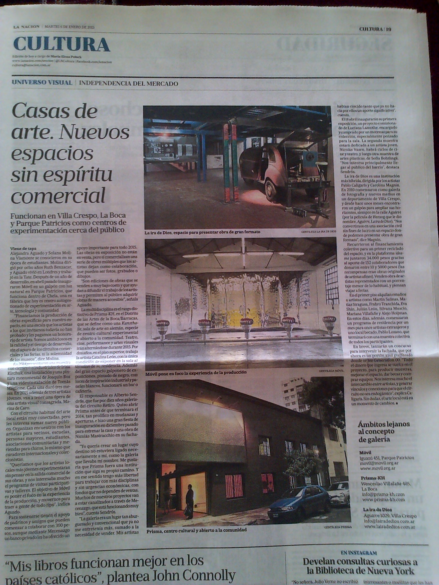 Ni galería ni centro cultural. En la ciudad aparecieron en los últimos meses nuevos proyectos dedicados al arte sin espíritu comercial. Organizaciones no gubernamentales potencian nuevos circuitos en barrios periféricos, con amplitud de criterio y de espacio, libertad curatorial e independencia del mercado. Móvil, La ira de Dios y Prisma-KH inauguran una nueva tradición de salas de mediana escala sin fines de lucro, que en Europa y Estados Unidos no son novedad y que en América latina están comenzando a cobrar fuerza.