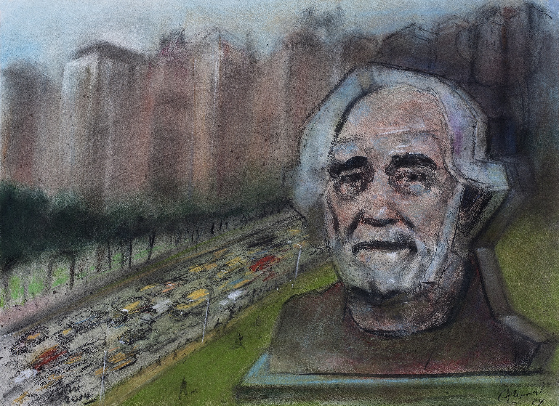 ROUX: –Vos tenés la línea mucho más firme. Responde a un impulso interno, que no te lo da nadie más que la naturaleza. Una precisión en lo que querés decir que es inapelable. El signo tuyo. Eso es extraordinario. A pesar de los enormes conocimientos que tenés, dejás mucho librado a ese profundo caudal con el que naciste. Dibujás como un chico, dibujás… en sintonía con tu pensamiento. En cambio, yo me tengo que ir acercando al dibujo, se me escapa para un lado o para el otro, trato de hacerlo, voy ajustándome. Es mi característica.