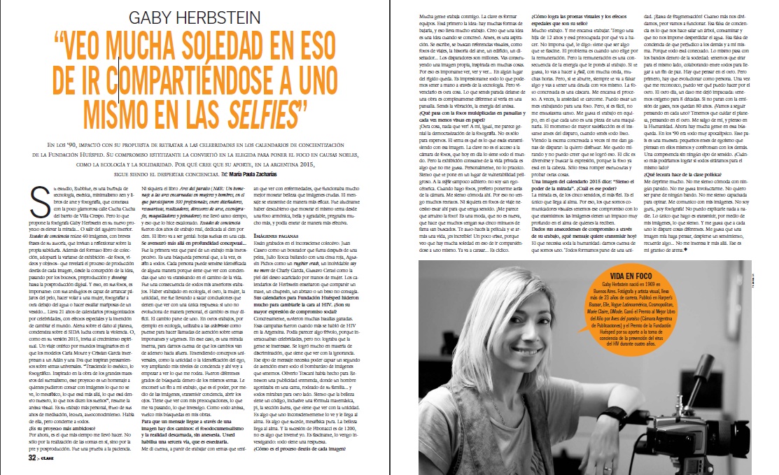 Su estudio, Bubblue, es una burbuja de tecnología, estética, minimalismo zen y libros de arte y fotografía, que contrasta con la poco glamorosa calle Cucha Cucha del barrio de Villa Crespo donde está ubicada. Pero lo que propone la fotógrafa Gaby Herbstein en su nuevo proyecto es elevar la mirada… o salir del agujero interior. Estados de Conciencia reúne 40 imágenes con breves frases de su autoría, que invitan a reflexionar sobre la propia sabiduría. Este año se presentará en formato libro de colección y exhibición de fotos, videos y objetos, que revelará el proceso de producción detrás de cada imagen, desde la concepción de la idea, pasando por los bocetos, preproducción, shooting y postproducción digital. Y esto en las fotos de Gaby Herbstein es importante: con sus artilugios prodigiosos es capaz de arrancar pájaros del pelo, hacer volar a una mujer, fotografiar a otra debajo del agua o hacer estallar mariposas de un vestido. Herbstein lleva 21 años de calendarios protagonizados por celebridades, con efectos especiales y la intención de cambiar el mundo. Alerta sobre el daño al planeta, concientiza sobre el Sida, lucha contra la violencia o, como en este último caso, invita al crecimiento espiritual.