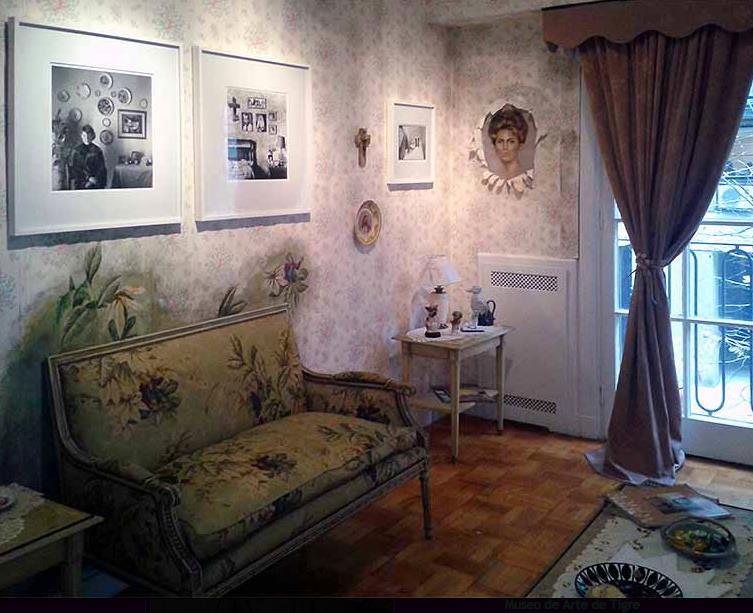 En estos días se ve en la galería Rolf (Posadas 1583) una especie de origen de todo eso: sus primeros retratos en blanco y negro, y una instalación que reproduce el living de la casa de sus padres tal como era en su infancia santafecina, sólo que el tapizado de flores del sillón trepa por el empapelado también floral, emerge un retrato del papel descascarado y se multiplican los animalitos de porcelana y las carpetas de crochet.