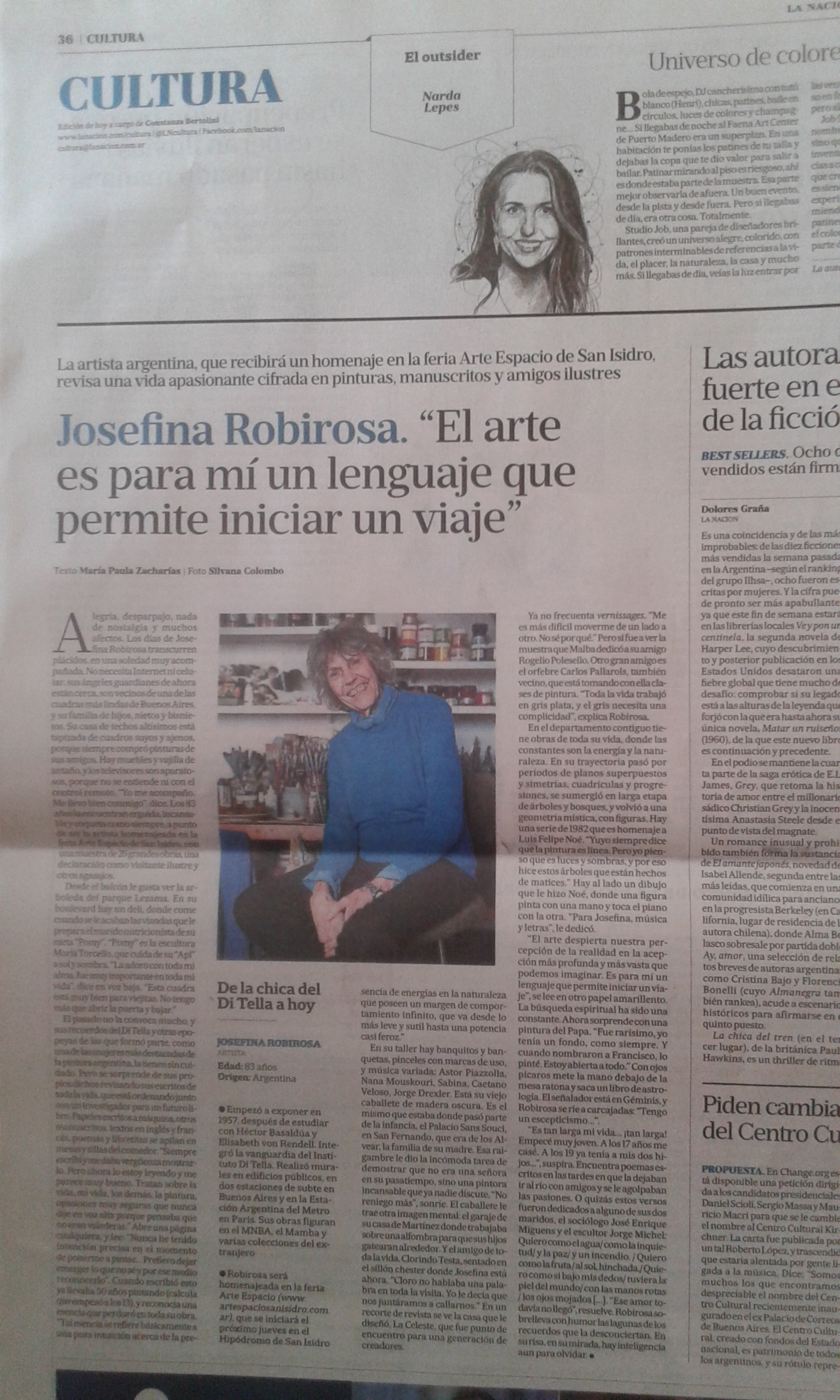 Publicada en La Nación Cultura, 8/8/15. Link: http://www.lanacion.com.ar/1817362-josefina-robirosa-el-arte-es-para-mi-un-lenguaje-que-permite-iniciar-un-viaje