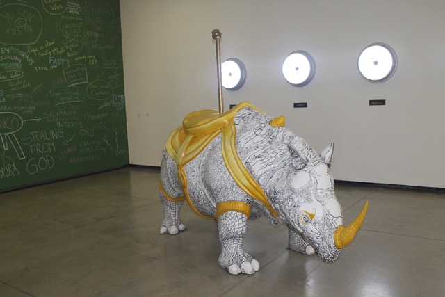 Lo primero que se ve al entrar en la sala es un rinoceronte tamaño natural con silla de montar y decorado como las manos de una novia con pintura de henna. “Evoca un famoso grabado de Durero, que registró –sin que Durero lo haya visto– el regalo de un rey de la India al rey de Portugal, que para desgracia del rinoceronte, murió en el trayecto. Pero esa imagen de Durero fue la primera de un rinoceronte en Occidente. Un elemento significativo de los momentos de intercambio pre-coloniales, un envío de buena voluntad”, explica. La escultura fue hecha para una muestra en Portugal, para completar aquel gesto quinientos años después. Más allá se ven un pizarrón lleno de palabras del mundo de la Economía y los relojes que en vez de las horas marcan estados de ánimo: ansiedad, deber, culpa, apatía, asombro, fatiga. “Nuestra experiencia del tiempo es uno de los principales operadores de la cultura y la economía”, señala Medina.