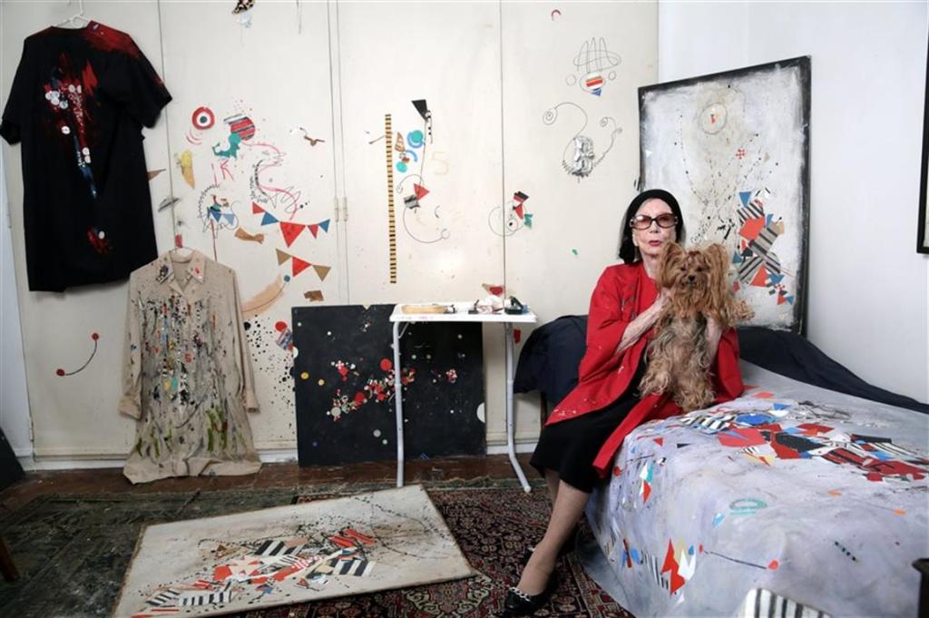 Nunca se interesó por hacer una carrera de artista, exponer o insertarse en el mercado. Sigue igual que a los 85, cuando exhibió su primera retrospectiva en el Museo Nacional de Arte Decorativo, recién ingresada al circuito del arte después de una vida de pintura en solitario: la misma vincha negra enmarcando su cara de piel blanquísima y los ojos celestes escondidos detrás de anteojos oscuros. Sobre su atuendo de señora -pollera negra, chatitas de charol, medias de nylon- lleva un delantal manchado, en el que limpia sus pinceles. Lo adornó con brillos y lentejuelas. Pinta sobre aquella alfombra persa que empezó a manchar en su casa de soltera (ahora ya está puesta del revés y de todas formas no le queda más espacio para colores; en ese metro cuadrado puede leerse el mapa de su vida). Pinta en grandes telas, pedacitos de cartón, papel de diario, las páginas de un libro y, en su taller, también se volvieron obra las cortinas y las paredes. «Tengo un ir y volver con los cuadros. Ahora estoy haciendo cosas más abstractas», se define, y señala un papel de diario donde trazó un remolino de sombras.