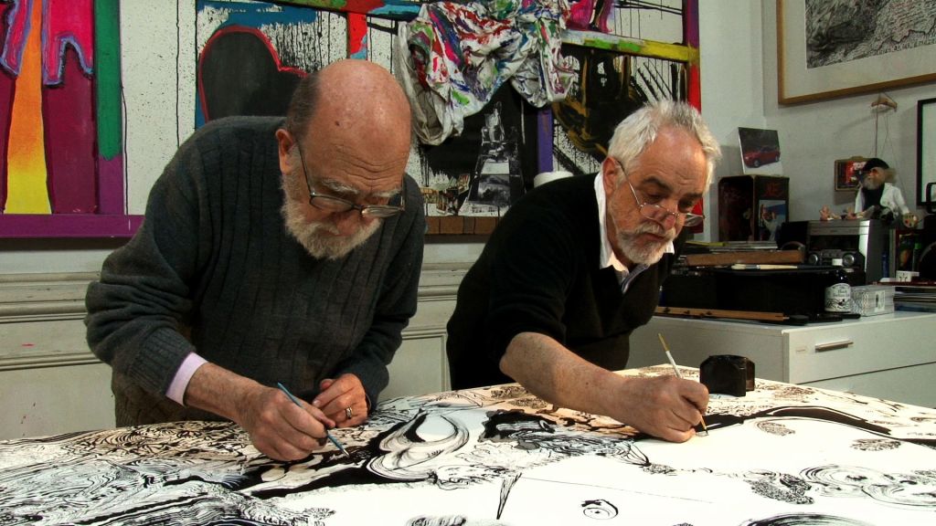 Compartir la hoja y hacer un dibujo juntos. De eso se trata el juego que dos parejas de maestros encararon y que se describe en la película que se estrena hoy: A cuatro manos. Pintar de a dos: una discusión sobre pintura. Luis Felipe Noé y Eduardo Stupía, por un lado, y Guillermo Roux y Carlos Alonso, por otro, se aventuraron a trabajar en un mismo lienzo. El documental deja un testimonio de ese proceso, y es testigo del nacimiento de obras únicas. A 4 manos fue rodada por muchas manos más. Es una coproducción de Untref Media con el Laboratorio Audiovisual de Investigación y Experimentación (LaIE) de la Maestría en Periodismo Documental, que surge a partir de una idea de su director, Osvaldo Tcherkaski, y se realiza con un equipo de profesionales de Untref Media y docentes y alumnos de la maestría. Tcherkaski vio en 2011 la muestra ¡Me arruinaste el dibujo!, de Noé y Stupía, en el Centro Cultural Borges. Luego sumó al proyecto el registro de la exposición de Roux y Alonso, Mano a mano, en la galería RO Art en 2014. Las dos muestras tuvieron una larga itinerancia.