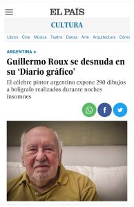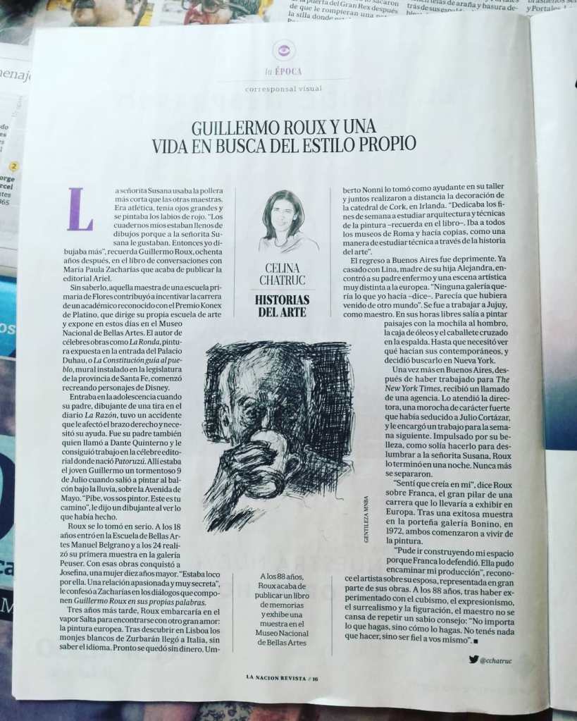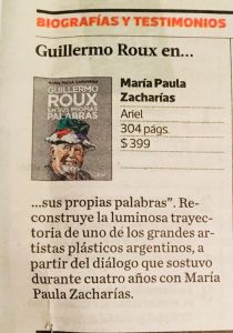 «…También intentó escribir diarios. Tiene varios comenzados. Pero le frena por ahora la necesidad de incluir a personas que quizás no quieran aparecer. En cambio, aceptó repasar su vida, semana a semana, frente a la periodista cultural Paula Zacharías, que ahora se publica bajo el título Guillermo Roux en sus propias palabras. Recuerda allí las horas que pasaba de niño viendo dibujar a su padre y la paciencia con la que su madre le enseñó la técnica de pintar acuarelas. De adolescente pasó un tiempo como ilustrador de revistas antes del viaje iniciático a Europa, con apenas 19 años. Fue el primero de muchos de este hombre que vivió en Roma, Nueva York, Jujuy, Buenos Aires y se proclamó artista a tiempo completo».
