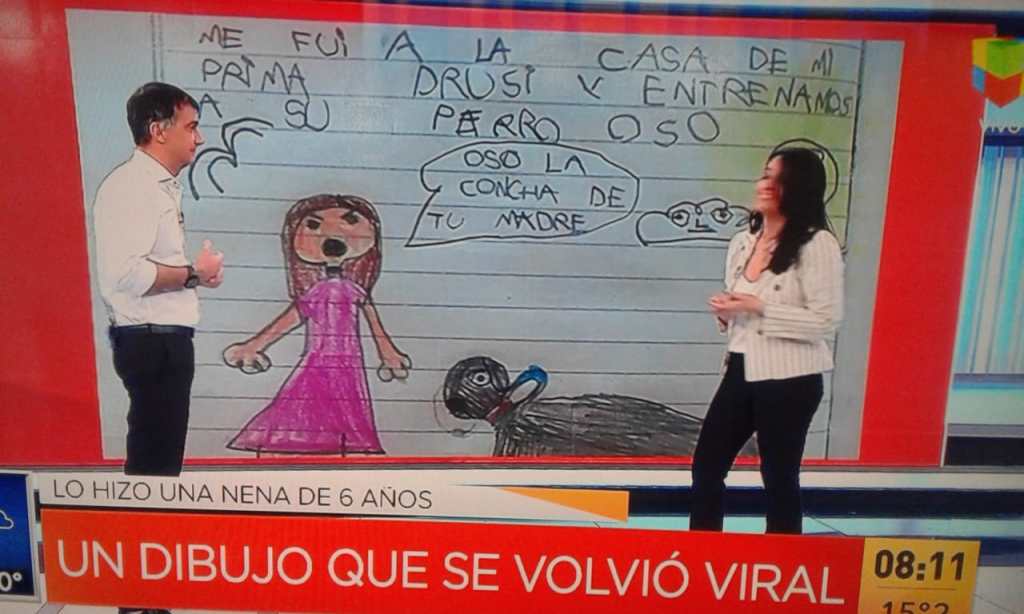En la clase de Lengua de primer grado, la maestra le pidió a sus alumnos que se transformaran en periodistas por un rato e hicieran un dibujo con «la noticia del fin de semana». Entonces ella agarró sus lápices y se puso a armar lo que podría ser la tapa de su diario. El resultado fue un tuit viral, que ya acumula más de 90 mil «me gusta» y no para de generar carcajadas en las redes sociales.