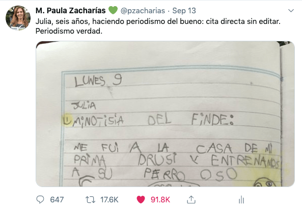 La primera reacción de Paula fue la risa. Luego le pidió a su hija que borrara el insulto, pero ella se negó y, con toda razón, justificó: «Es la verdad». Orgullosa por la reacción con criterio periodístico de su niña, decidió compartir el dibujo en Twitter y, casi al instante, se viralizó.