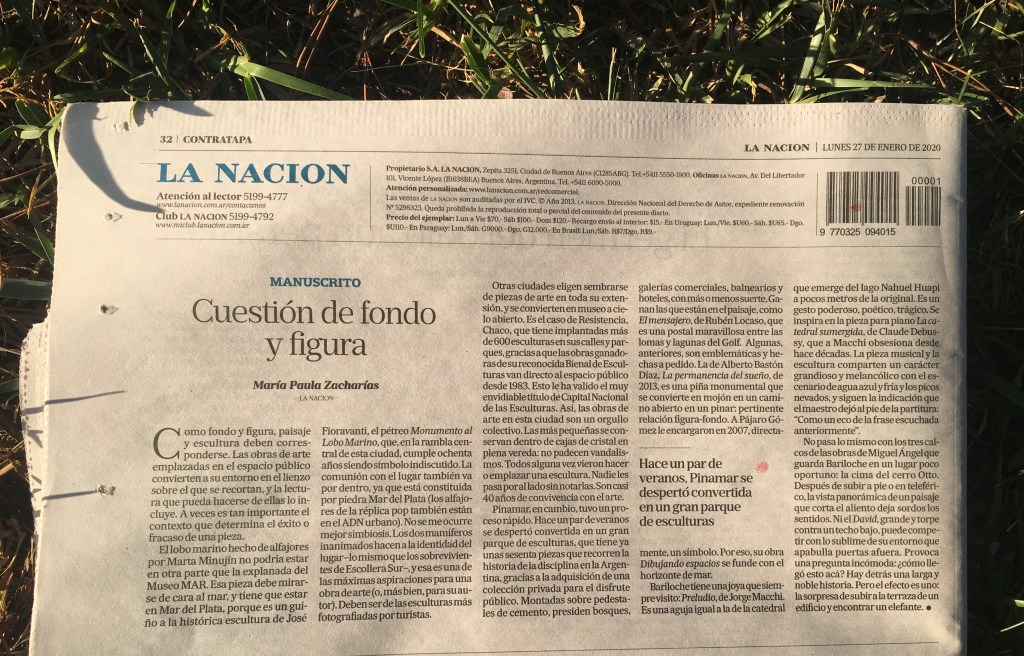 Bariloche tiene una joya que siempre visito: Preludio, de Jorge Macchi. Es una aguja igual a la de la Catedral que emerge del lago Nahuel Huapi a pocos metros de la original. Es un gesto poderoso, poético, trágico y profundamente hermoso. Se inspira en la pieza para piano La Catedral Sumergida, de Claude Debussy, que a Macchi obsesiona desde hace décadas. La pieza musical y la escultura comparten un carácter grandioso y melancólico con el escenario de agua azul y fría y los picos nevados, y siguen la indicación que el maestro dejó al pie de la partitura (que es recurrente en la producción de Macchi): «Como un eco de la frase escuchada anteriormente».
