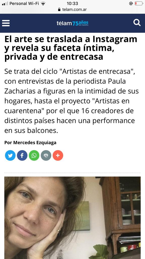 «Llevaba más de un mes encerrada. Extrañaba el arte. Me di cuenta de lo importante que es acompañarnos. Y entonces se me ocurrió este ciclo de mini entrevistas medio chusmas, una incursión en cocinas y talleres de artistas visuales argentinos, para acompañarnos entre todos y darnos la cuota necesaria de arte que estamos extrañando», cuenta a Télam la periodista Paula Zacharías.