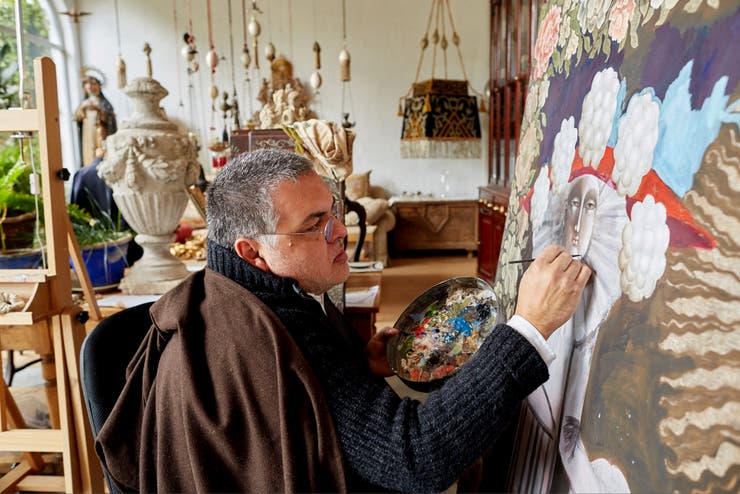 «Me he dedicado a estar encerrado en mi taller toda mi vida», dice Sergio Roggerone, otro pintor incansable, desde su casa estilo barroco en medio de viñedos en Mendoza. Estaba pintando una serie de retratos monocromos de mediano formato, pero con los días de silencio se envalentonó: «Viendo que vamos a estar encerrados por un buen tiempo, me he animado a hacer obras de cinco por tres metros, pinturas para dejar a la vida, en algún museo, porque son invendibles. Obras que quiero dejar en Argentina, obras testigos. Son de la medida de las puertas de mi taller porque, si no, no las voy a poder sacar», dice.