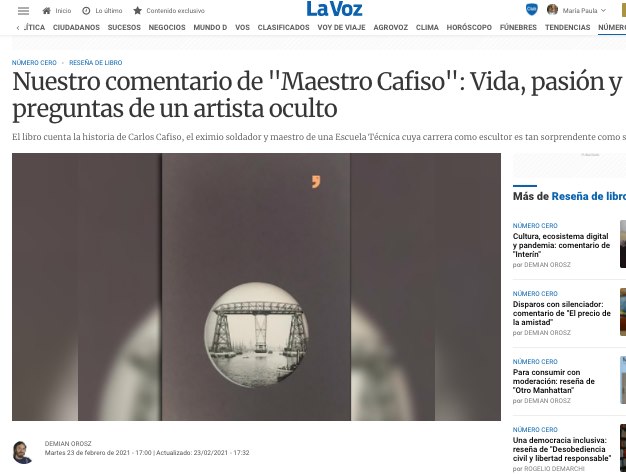El nuevo libro de María Paula Zacharías cuenta la historia de un artista que no sabe que lo es. Un hombre de Mataderos que siempre se ganó la vida como soldador y que en la vejez descubre que puede crear esculturas, y eso le cambia la vida. El encuentro con el arte se da en él de manera apasionada y meticulosa: crea réplicas a gran escala de íconos de la ingeniería como la Torre Eiffel o el Puente Transbordador Nicolás Avellaneda. De París a La Boca, investiga, cambia planos de escala y se obsesiona con lograr la perfección. Mientras alquila sus piezas como atracciones para casamientos, descubre el arte contemporáneo cuando conoce a Daniela Trajtenberg y Agustín Valle, dos artistas que quieren aprender a soldar para terminar una obra que madura a lo largo de los años. En la vida de Cafiso hay automovilismo, billar, tango y un romance contrariado, que lleva varias décadas de desencuentros y felicidades. ¿Quién olvida al primer amor?, se lee en estas páginas. En este relato de no ficción, los protagonistas y la autora van ensayando respuestas en torno a otro gran misterio: qué es el arte. Propone Zacharías en un pasaje del libro: «Me quedo con mi natural respeto a la destreza técnica, los hombres sencillos, los sueños concretados, las pequeñas epopeyas privadas, el culto al oficio, la trayectoria comprobable y la autoinscripcrión en el campo del arte. Me quedo con la democratización del arte que abraza a quien quiera colarse en sus filas: un artista para cada espectador, una obra para cada gusto».