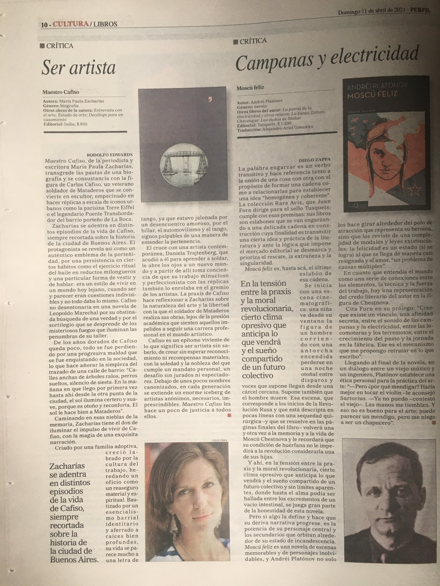 Un perfil de Carlos Cafiso, un artesano soldador y “quintaesencia de la porteñidad” que trabajó en autos ganadores del Turismo Carretera, tuvo una orquesta de tango y reprodujo en pequeña escala la Torre Eiffel, se vuelve de pronto una disquisición sobre los motivos del arte, la experiencia del amor y los frutos que, tarde o temprano, brinda la perseverancia. “Llegué a Cafiso a través de Daniela Trajtenberg, una artista contemporánea que lo conoció cuando buscaba un maestro de soldadura para las esculturas que estaba desarrollando –cuenta Zacharías-. Cuando ella me contó de este personaje me pareció extraordinario: un hombre simple, que toda la vida se dedicó a soldar y a enseñar, con pasiones como la milonga, el billar y el automovilismo, con un amor contrariado, autor de una obra singular y preciosa. No pude más que escribir cuando por fin lo conocí”. En el retrato se filtran vivencias de la autora, periodista especializada en arte contemporáneo.