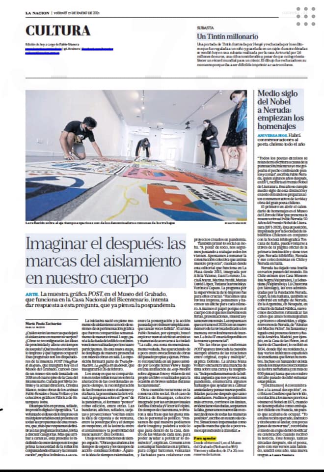 ¿Cuáles serán las marcas que dejará el aislamiento en nuestros cuerpos? ¿Cómo se reconfigurarán las ideas de proximidad y afecto en tiempos de asepsia? ¿Qué modos conllevará lo impreso y qué lugares ocupará? Esas preguntas son los disparadores de la muestra POST Imaginar el después, que inaugura mañana en el Museo del Grabado, curioso caso de un museo sin sede instalado en 2018 en el cuarto piso de la Casa del Bicentenario (Riobamba 985). Curada por Silvia Dolinko y la actual directora, Cristina Blanco, reúne obras de los artistas Pablo Rosales e Ivana Vollaro y los colectivos gráficos Fábrica de Estampas y Boba.