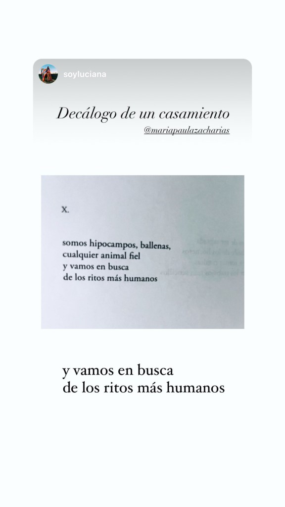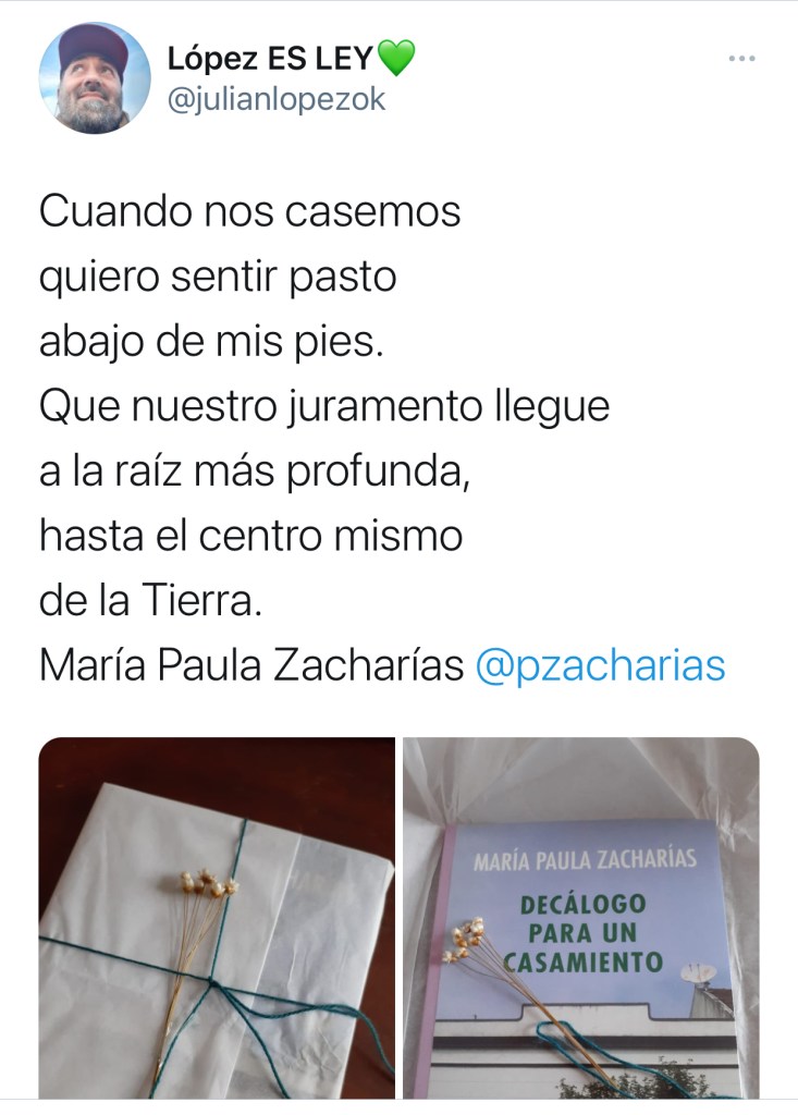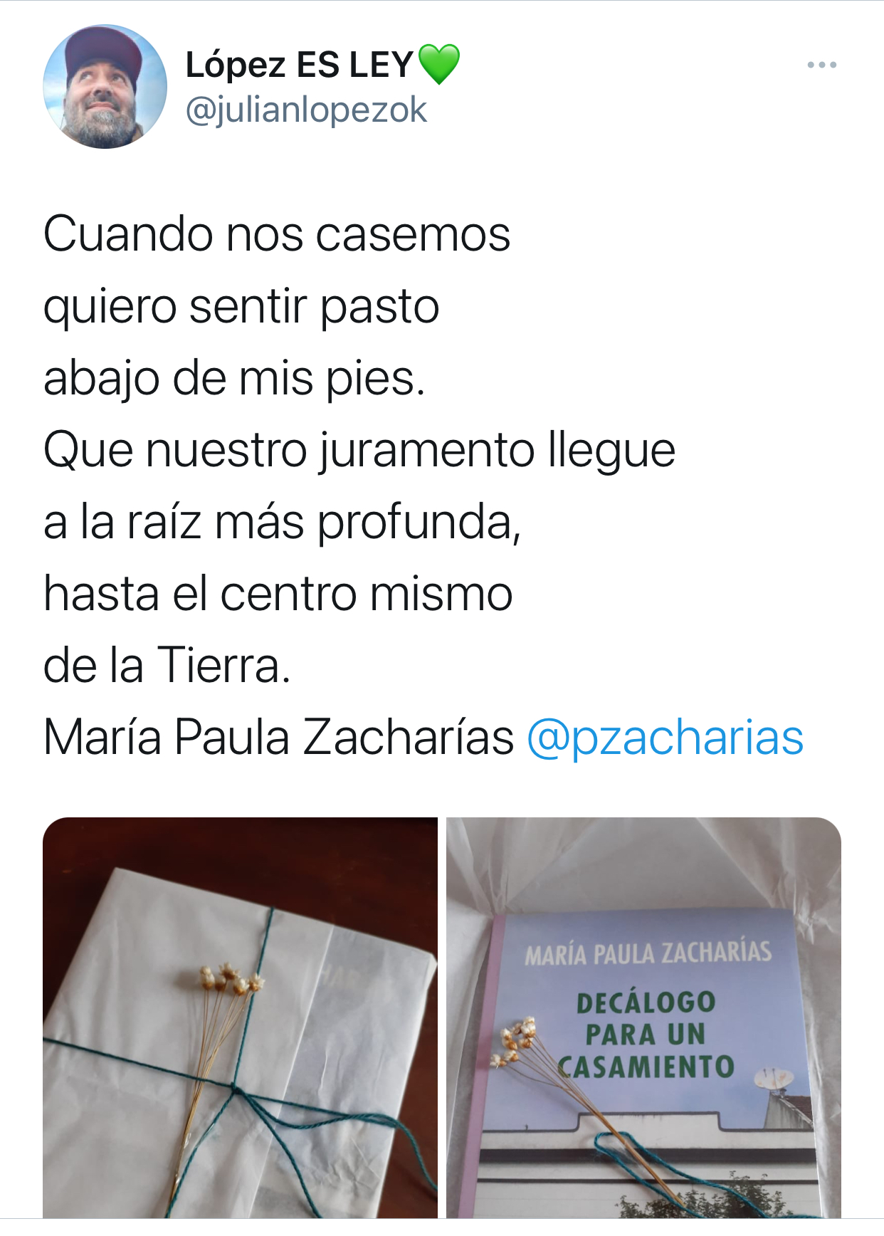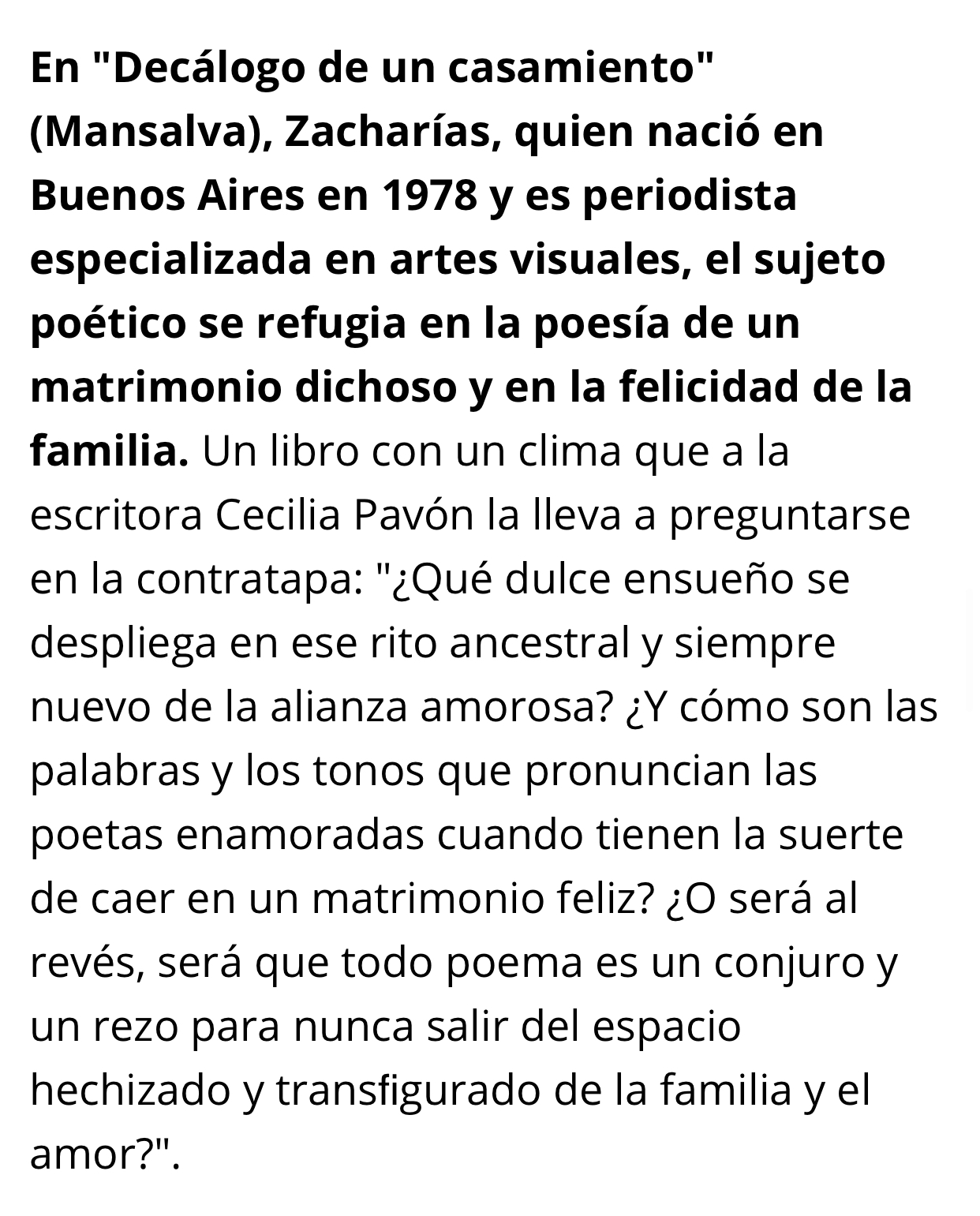 “En Decálogo para un casamiento, de María Paula Zacharías (Editorial Mansalva) parece que el matrimonio se trata de ser felices con lo que hay. Vivir en la eterna situación de casamiento, como reza el título (sí, rezar una plegaria). El casamiento es la fiesta y la ilusión de lo que vendrá. El matrimonio es lo que sucede después. María Paula sugiere amar una promesa, vivir el milagro de un colibrí, la fortuna de sentir los pasos de lx otrx, de que falte al trabajo, de los grillos por la ventana.”