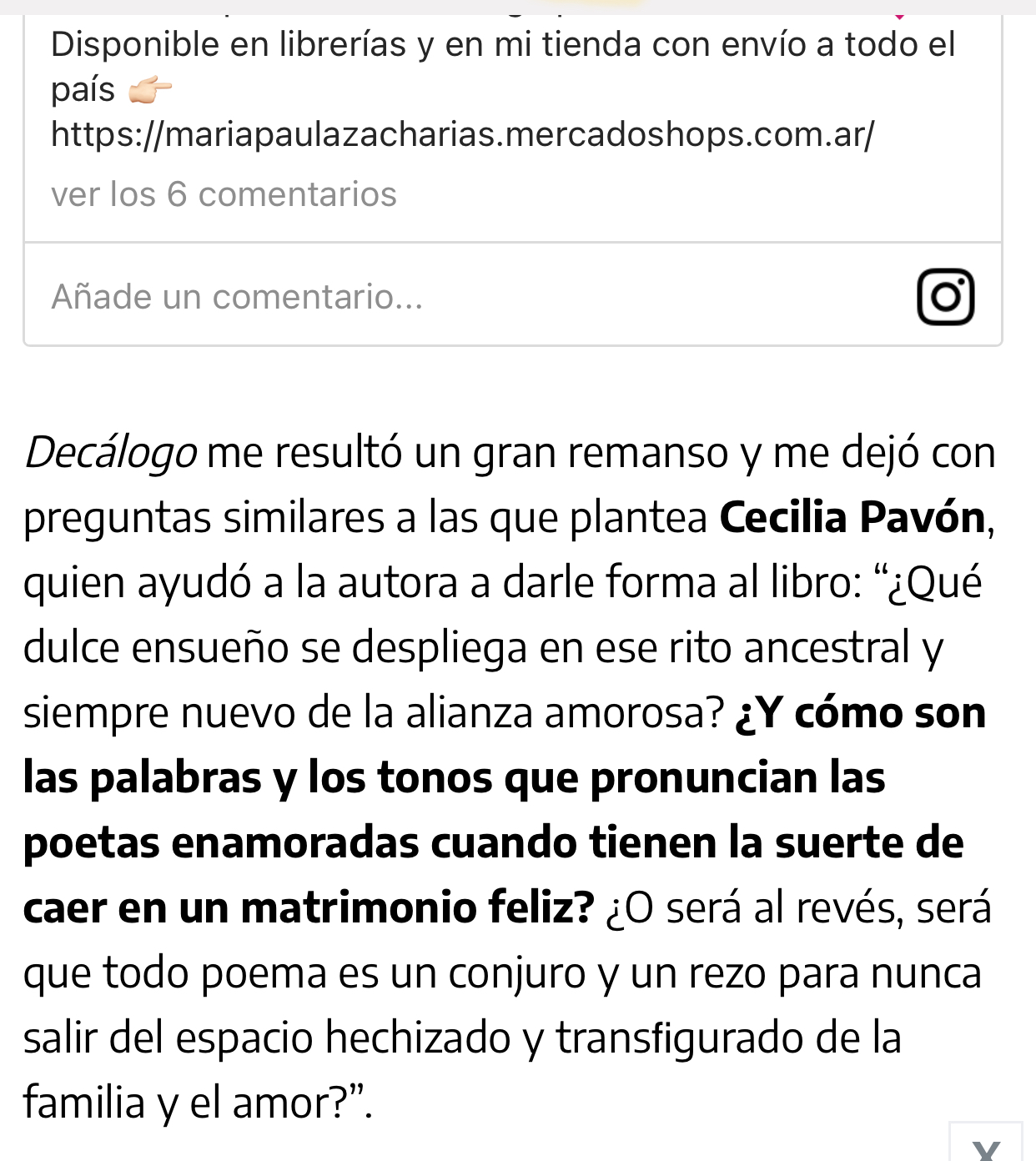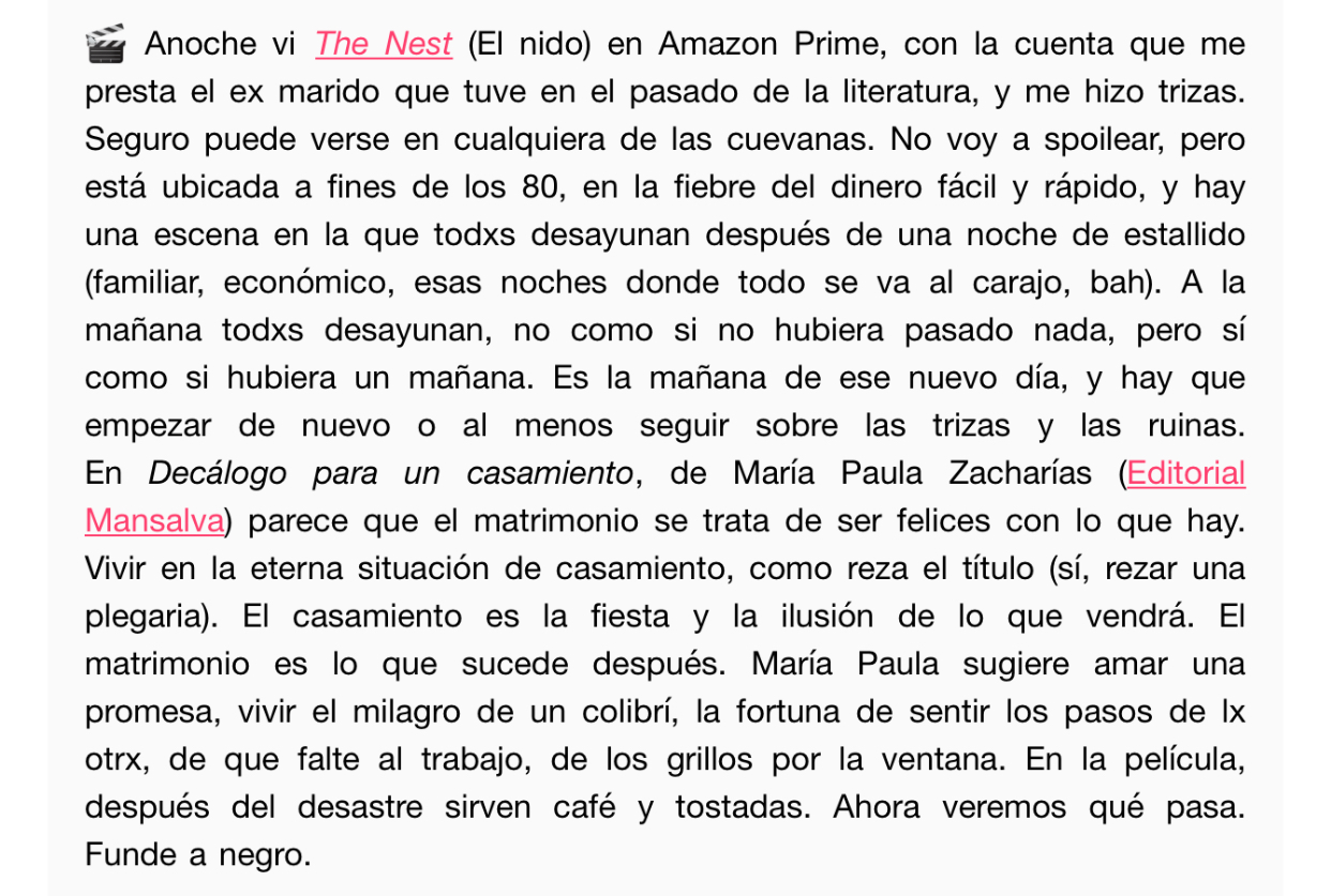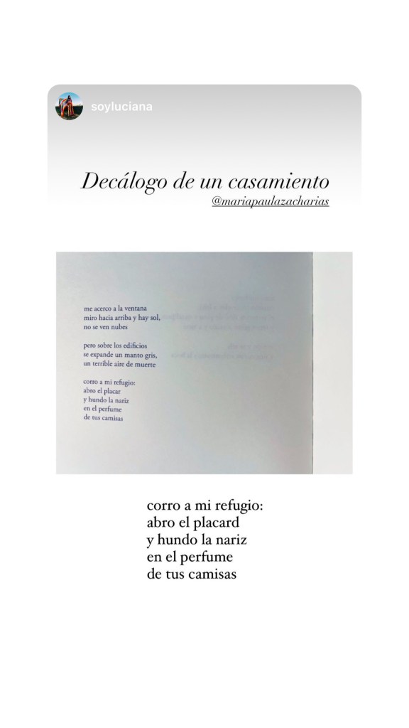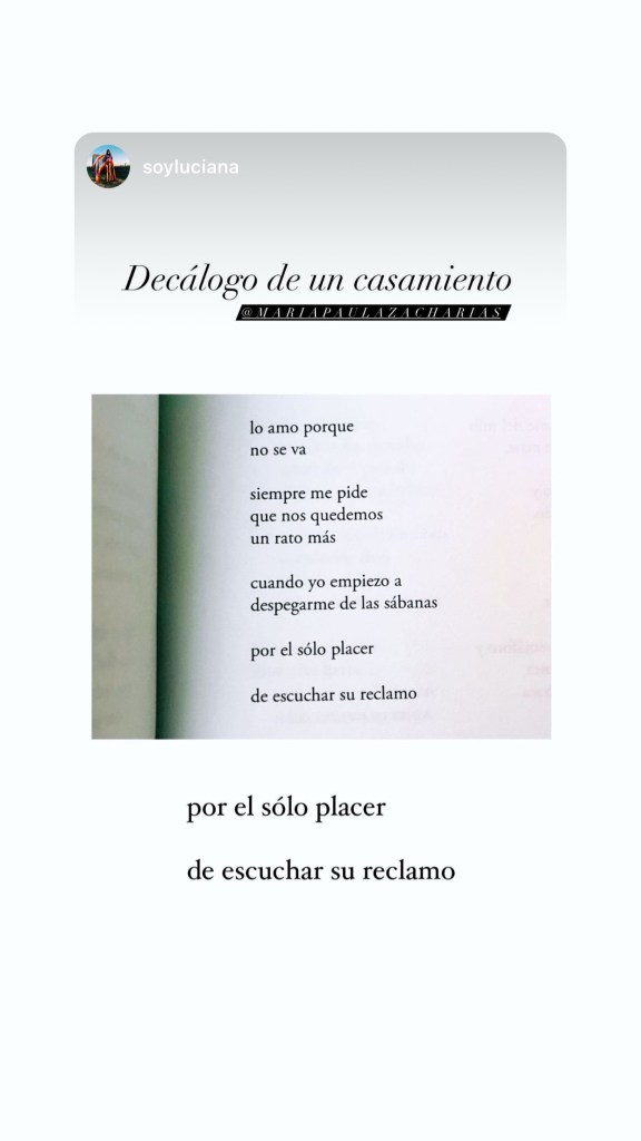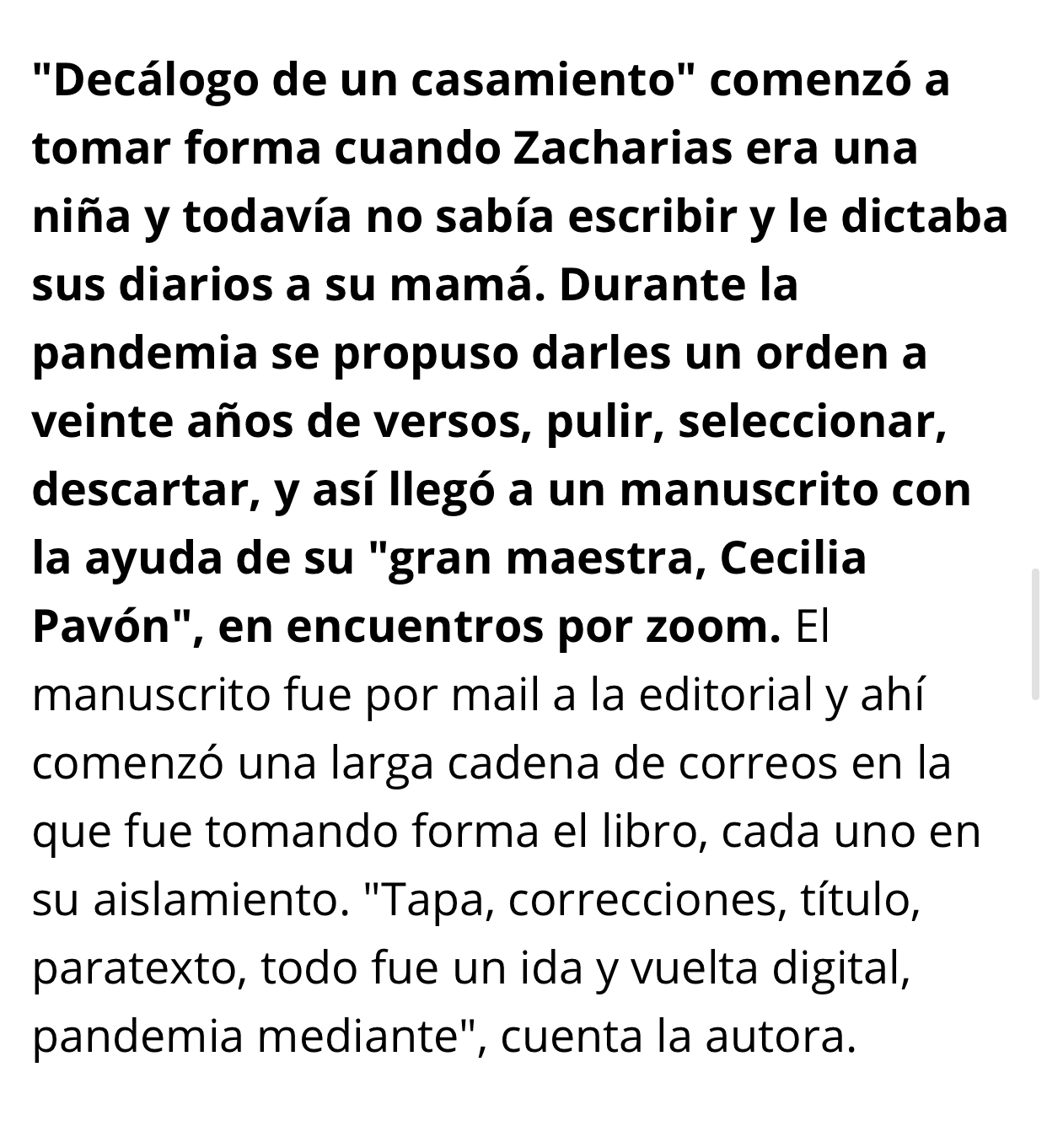 “En Decálogo para un casamiento, de María Paula Zacharías (Editorial Mansalva) parece que el matrimonio se trata de ser felices con lo que hay. Vivir en la eterna situación de casamiento, como reza el título (sí, rezar una plegaria). El casamiento es la fiesta y la ilusión de lo que vendrá. El matrimonio es lo que sucede después. María Paula sugiere amar una promesa, vivir el milagro de un colibrí, la fortuna de sentir los pasos de lx otrx, de que falte al trabajo, de los grillos por la ventana.”