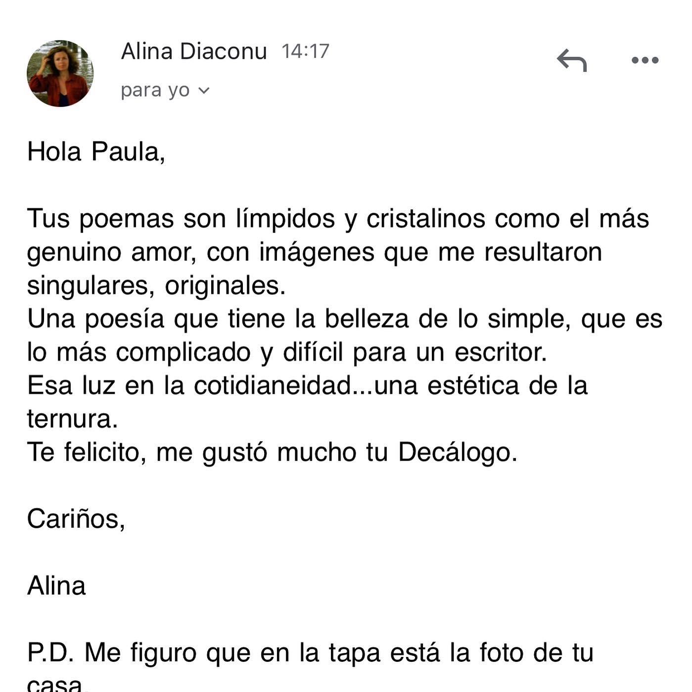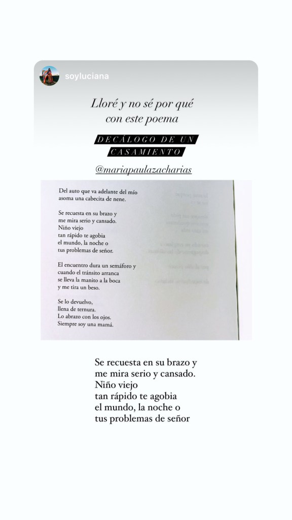 Es domingo y quiero quedarme a vivir en estos versos. Los poemas de 𝙳𝚎𝚌𝚊́𝚕𝚘𝚐𝚘 𝚙𝚊𝚛𝚊 𝚞𝚗 𝚌𝚊𝚜𝚊𝚖𝚒𝚎𝚗𝚝𝚘 de la poeta argentina María Paula Zacharías encuentran imágenes poderosas por lo simple y significativas, para hablar de las felicidades chiquitas del amor cotidiano. Una mamá que trabaja mientras escucha a sus hijes jugar o bañarse; una pareja que baila improvisado mientras el repulgue de las empanadas espera en la cocina; el bebé que le da de comer a la mamá, cada uno de los gestos proyecta la dimensión maravillosa de la felicidad natural que da el amor de verdad. Suena tan de ptra época, pero Zacharías logra que sea contemporáneo y posible. Una hazaña en la oscuridad de los vínculos de hoy.