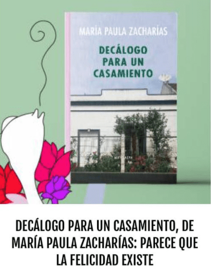 Reseña de Daniela Pasik en Digan sus elogios: https://digansuselogios.com/2021/07/31/decalogo-para-un-casamiento-de-maria-paula-zacharias-parece-que-la-felicidad-existe/