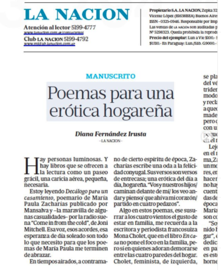 Link: https://www.lanacion.com.ar/opinion/poemas-para-una-erotica-hogarena-nid20042021/?fbclid=IwAR3R54EycRmU1qkV5gSqfbrDMr7EYGMF0YmGNr4BqzpIGyn5GkYZJ_bpQwA