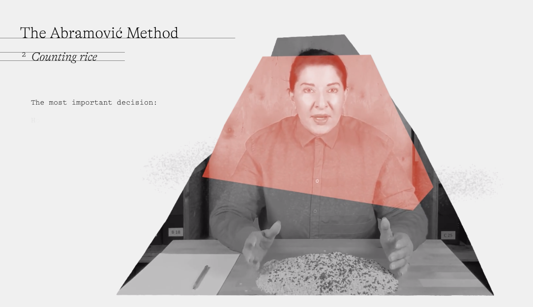 “Ser una artista de performance es una tarea muy difícil –declaró la artista al presentar esta iniciativa–. Necesita mucha preparación para que el rendimiento de larga duración funcione. Entonces, desarrollé diferentes ejercicios para ayudarme a generar fuerza de voluntad y concentración, traspasando límites físicos y mentales. Más tarde, comprendí que estos ejercicios pueden servir no solo a mí, sino a cualquier profesión en el mundo, por lo que los convertí en algo que llamo El Método Abramovic. Después de un año durante el cual volver a conectarnos con nosotros mismos nunca ha sido más importante, estoy encantada de compartirlos con el mundo en WeTransfer”.