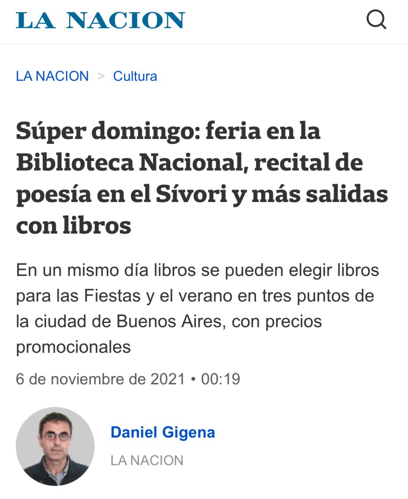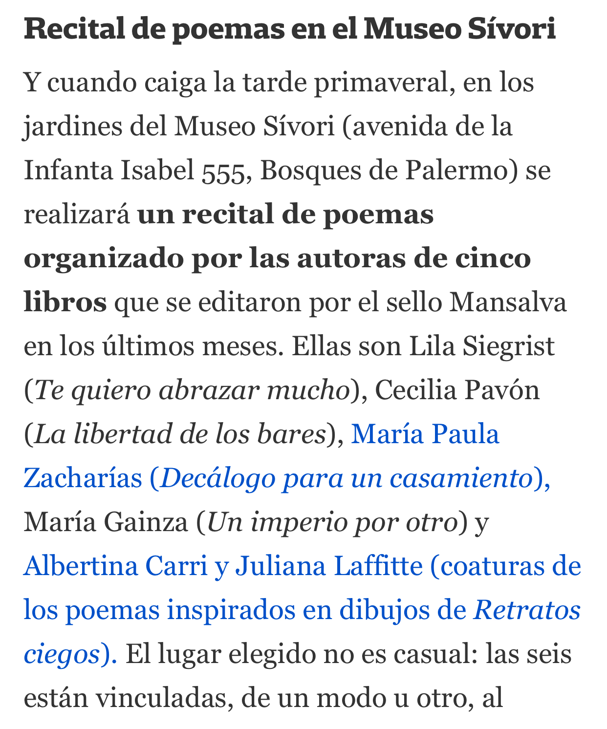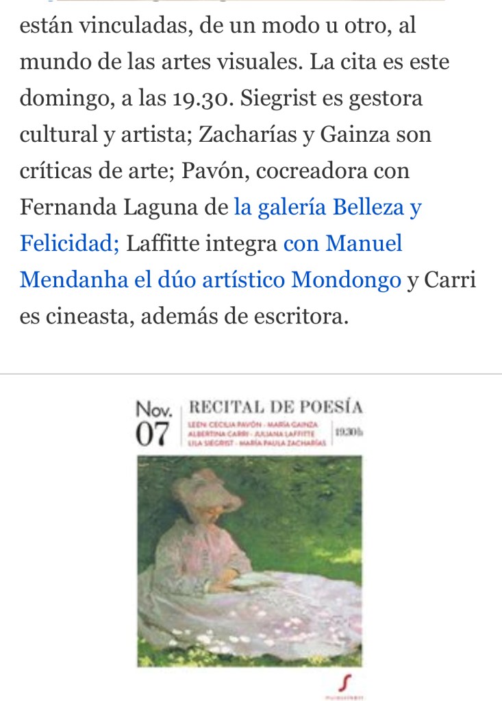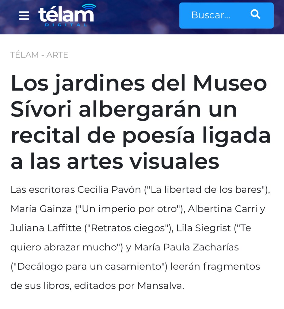 El domingo 7 de noviembre de 2021, con más de doscientas personas de público, bajo la luna y las estrellas, leímos poesía María Gainza, Juliana Laffitte, Albertina Carri, Lila Siegrist y yo, en este orden. Acá está el video: