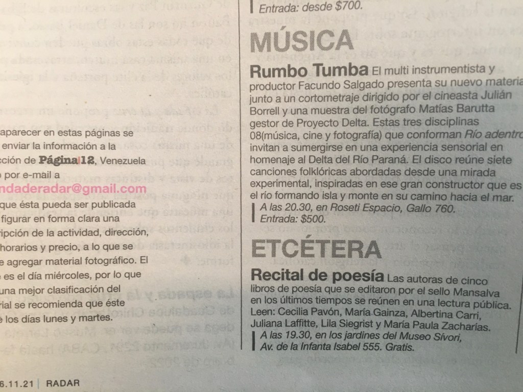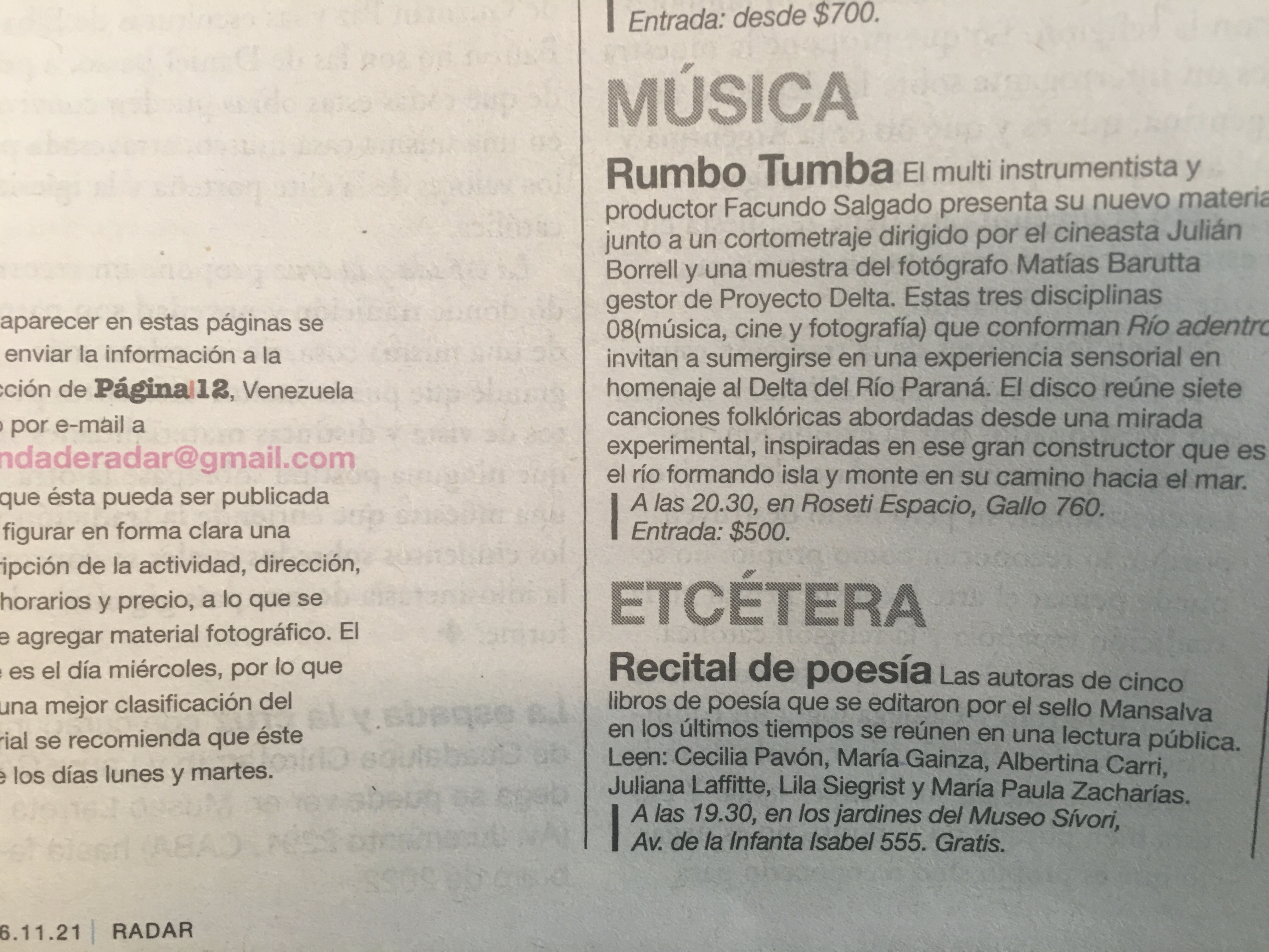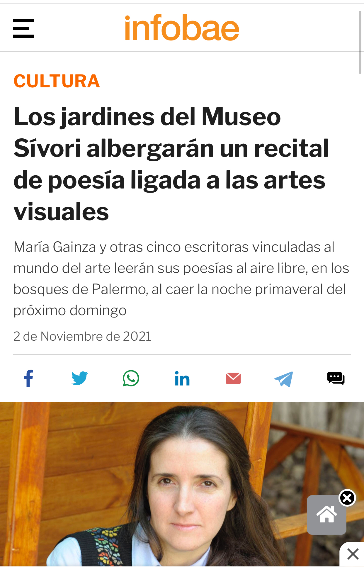 El domingo 7 de noviembre de 2021, con más de doscientas personas de público, bajo la luna y las estrellas, leímos poesía María Gainza, Juliana Laffitte, Albertina Carri, Lila Siegrist y yo, en este orden. Acá está el video: