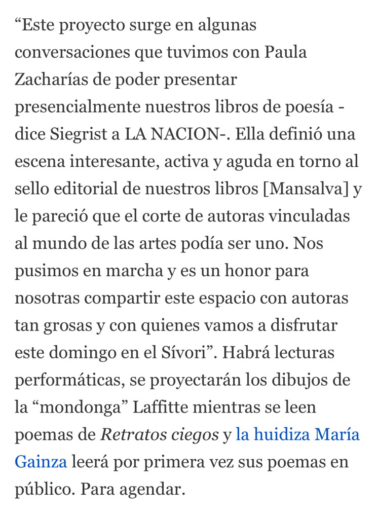 Y cuando caiga la tarde primaveral, en los jardines del Museo Sívori (avenida de la Infanta Isabel 555, Bosques de Palermo) se realizará un recital de poemas organizado por las autoras de cinco libros que se editaron por el sello Mansalva en los últimos meses. Ellas son Lila Siegrist (Te quiero abrazar mucho), Cecilia Pavón (La libertad de los bares), María Paula Zacharías (Decálogo para un casamiento), María Gainza (Un imperio por otro) y Albertina Carri y Juliana Laffitte (coaturas de los poemas inspirados en dibujos de Retratos ciegos). El lugar elegido no es casual: las seis están vinculadas, de un modo u otro, al mundo de las artes visuales. La cita es este domingo, a las 19.30. Siegrist es gestora cultural y artista; Zacharías y Gainza son críticas de arte; Pavón, cocreadora con Fernanda Laguna de la galería Belleza y Felicidad; Laffitte integra con Manuel Mendanha el dúo artístico Mondongo y Carri es cineasta, además de escritora. “Este proyecto surge en algunas conversaciones que tuvimos con Paula Zacharías de poder presentar presencialmente nuestros libros de poesía -dice Siegrist a LA NACION-. Ella definió una escena interesante, activa y aguda en torno al sello editorial de nuestros libros [Mansalva] y le pareció que el corte de autoras vinculadas al mundo de las artes podía ser uno. Nos pusimos en marcha y es un honor para nosotras compartir este espacio con autoras tan grosas y con quienes vamos a disfrutar este domingo en el Sívori”. Habrá lecturas performáticas, se proyectarán los dibujos de la “mondonga” Laffitte mientras se leen poemas de Retratos ciegos y la huidiza María Gainza leerá por primera vez sus poemas en público. Para agendar. 🥰